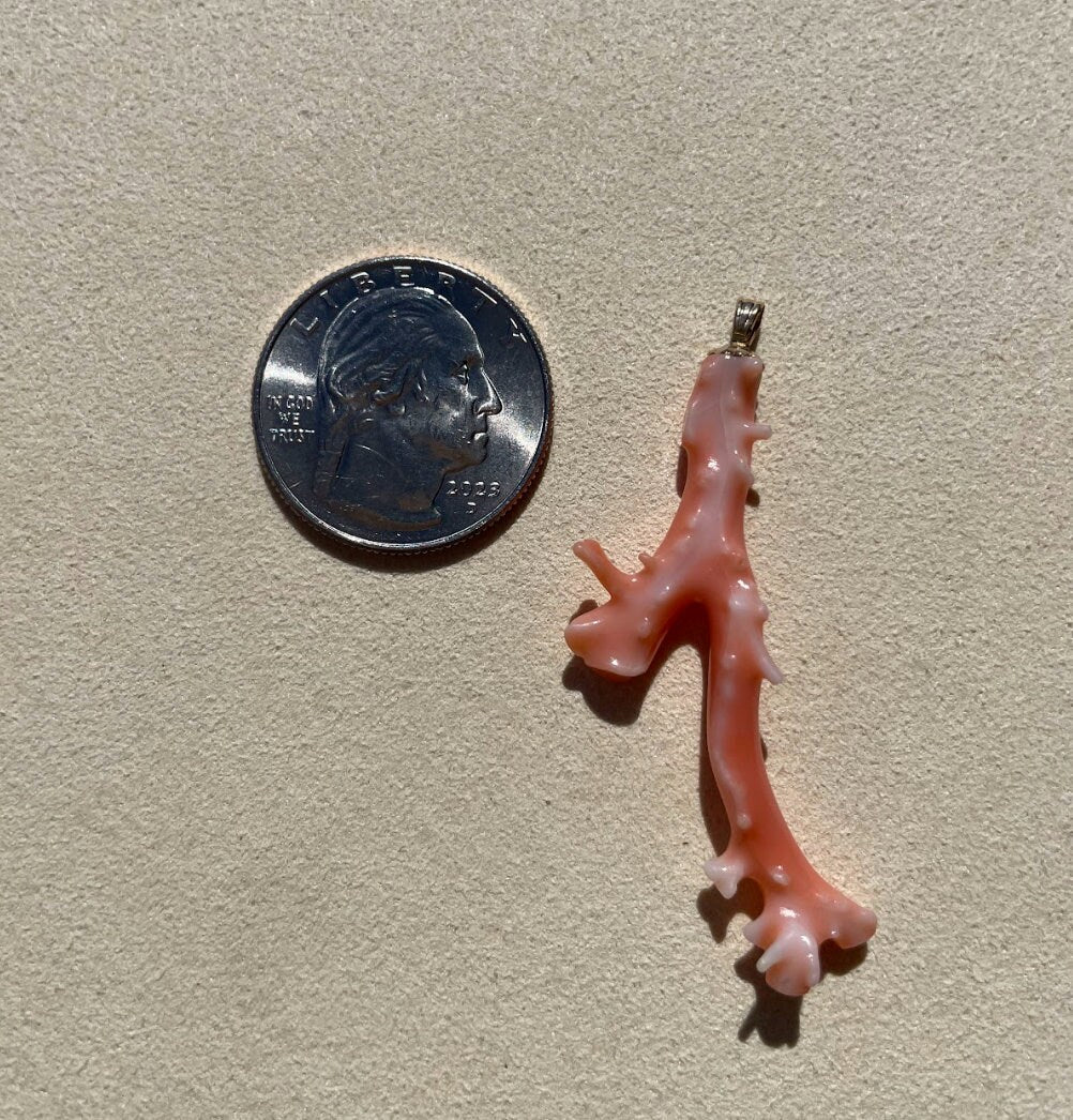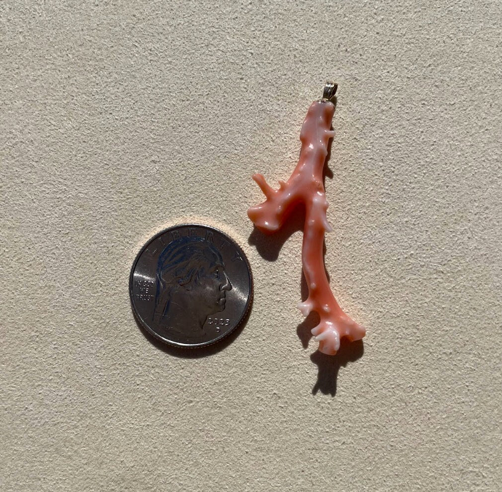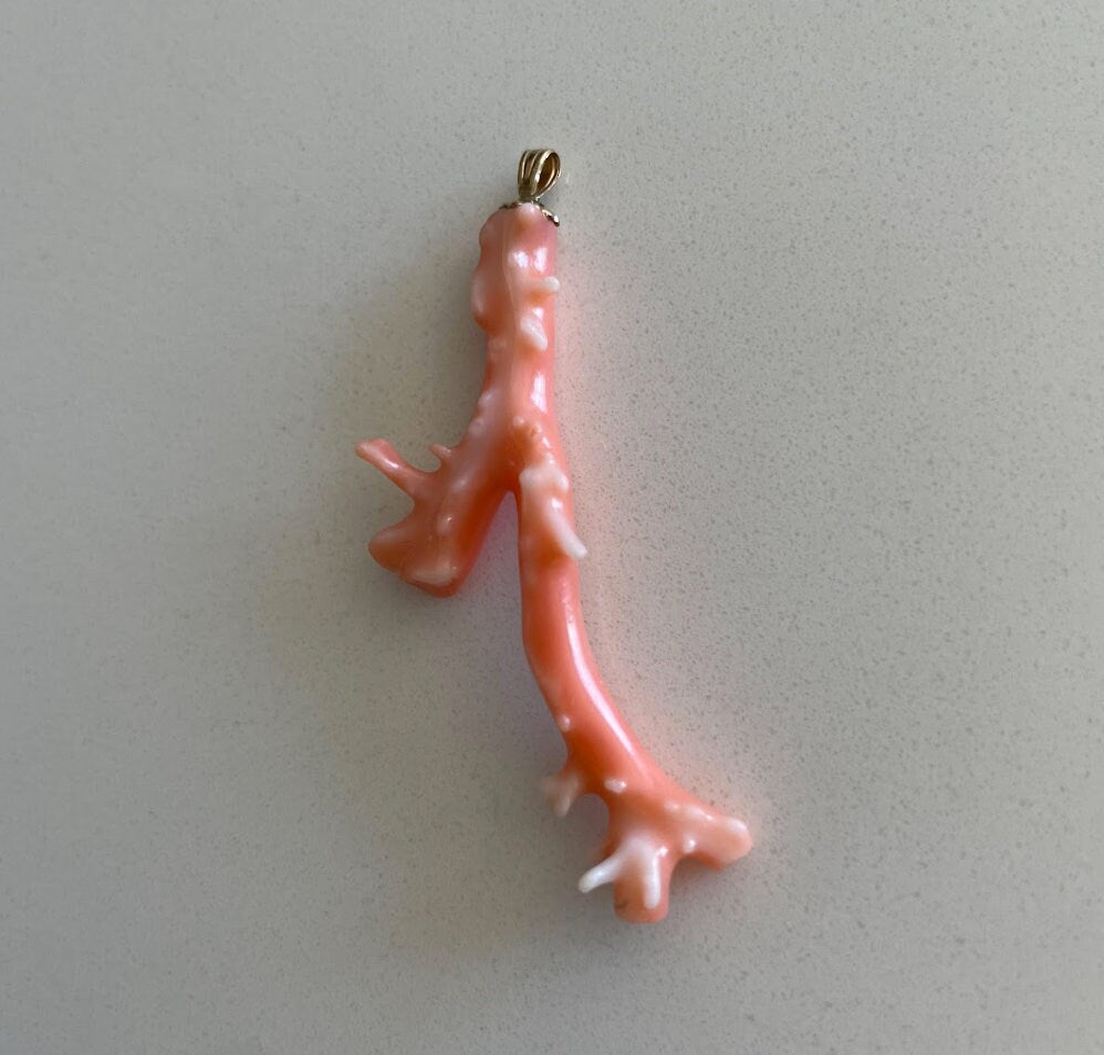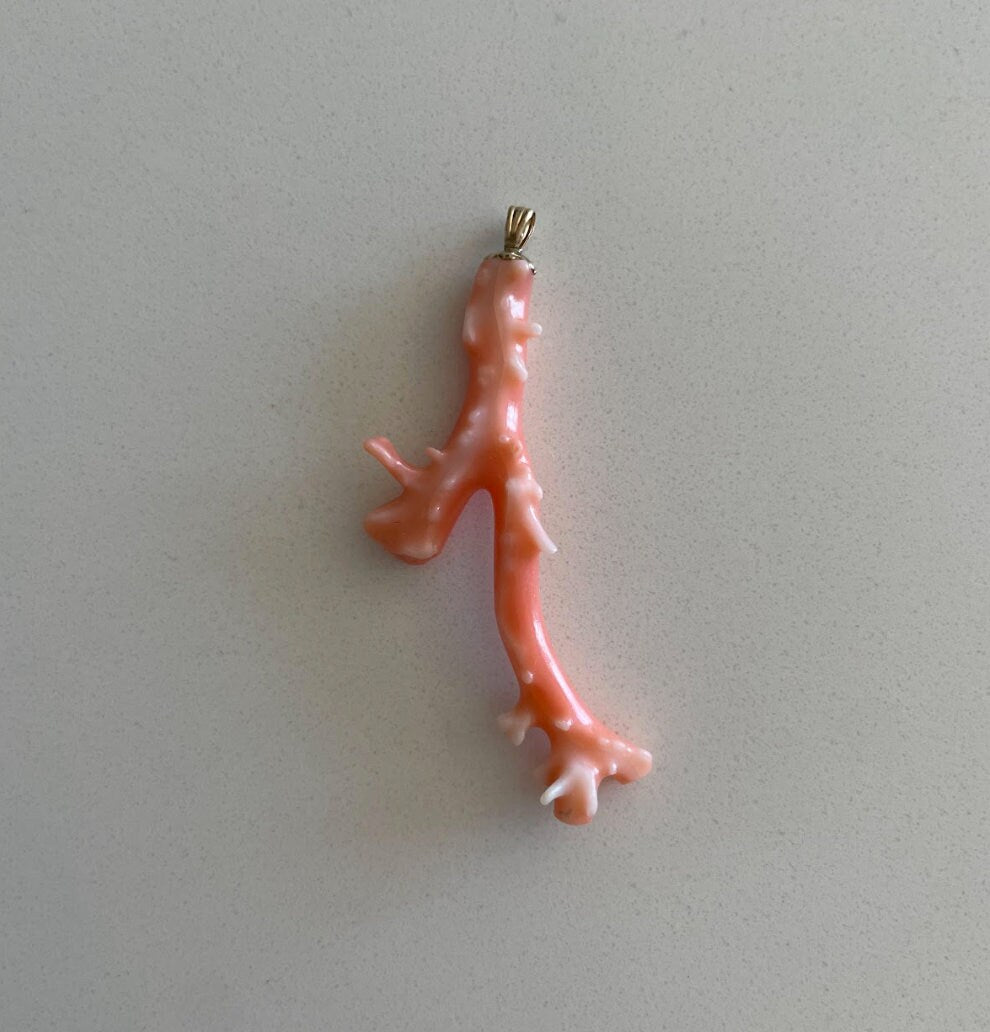 This estate pendant features a beautiful branch of angel skin coral with a 14k cap and bail. There seems to have been some soldering work done to the bail which could use a polish from your jeweler.