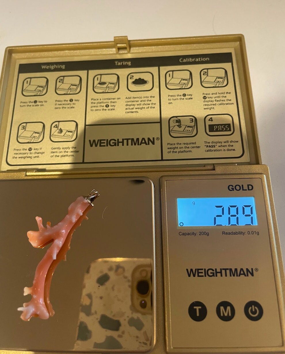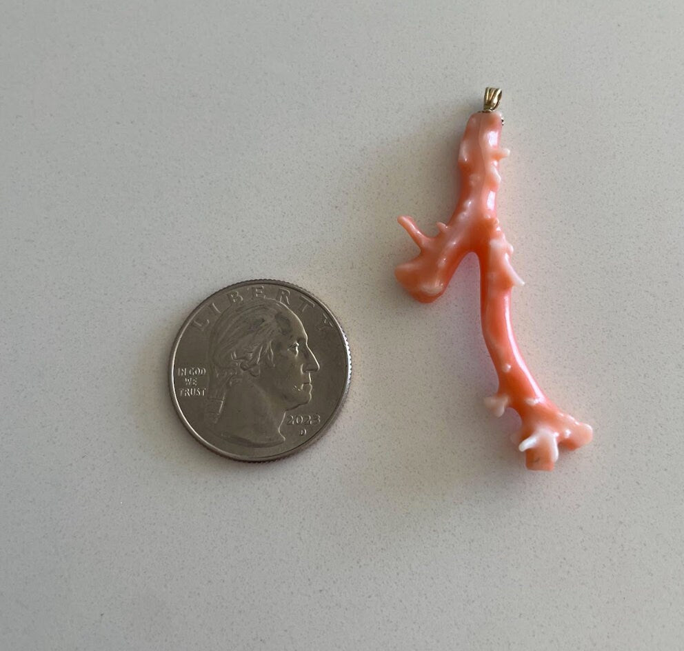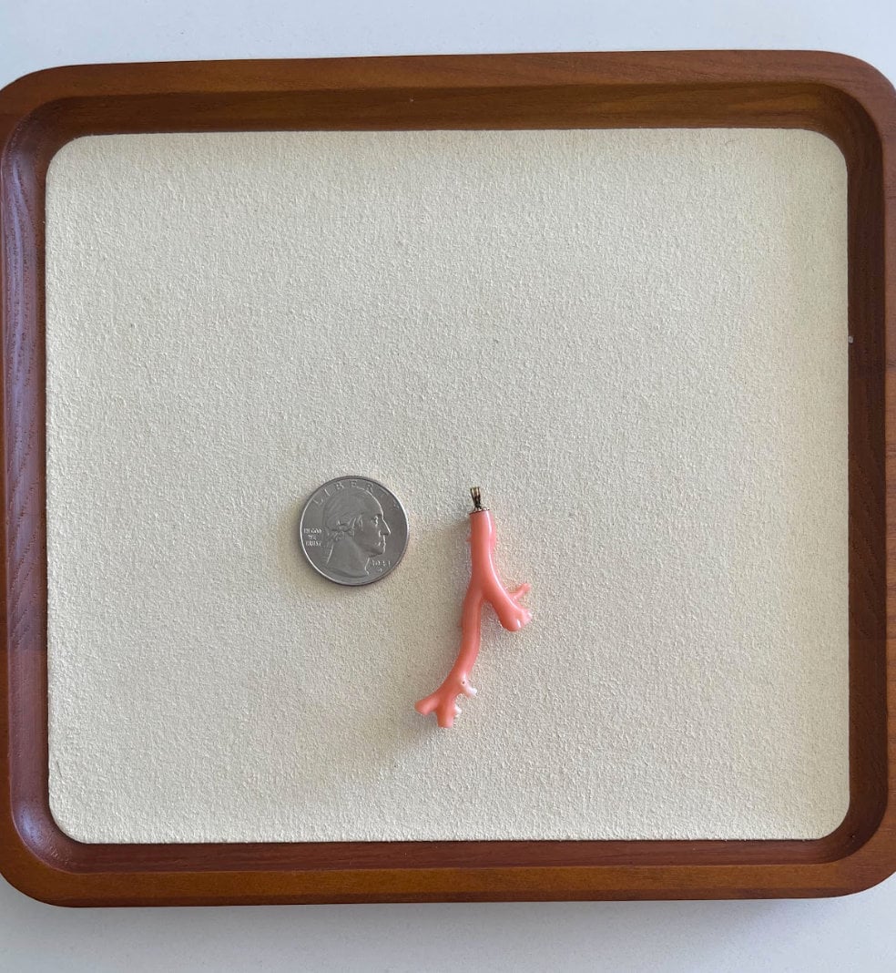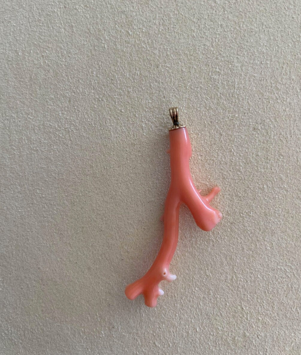 This estate pendant features a beautiful branch of angel skin coral with a 14k cap and bail. There seems to have been some soldering work done to the bail which could use a polish from your jeweler.