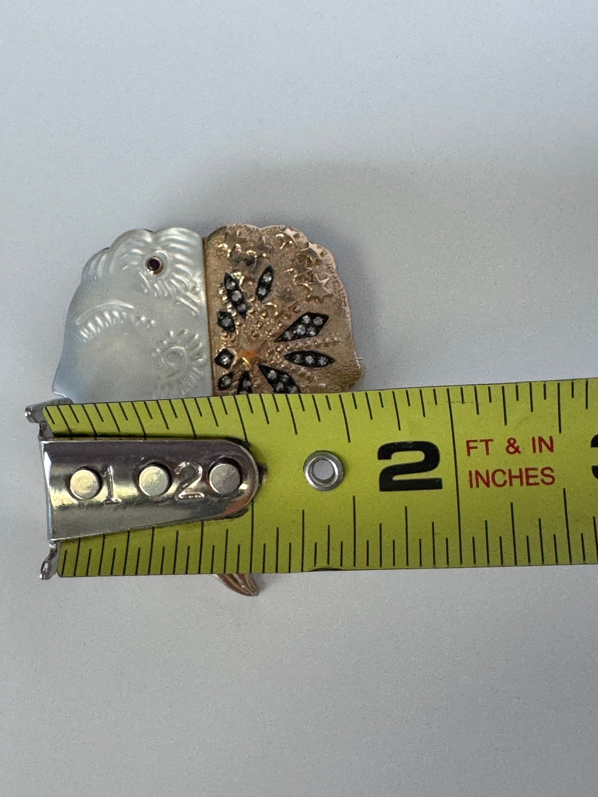 Condition: Exceptional condition befitting a museum piece. Mother of pearl carving retains all original detail with beautiful natural iridescence intact. Sterling silver shows rich original patination with no wear issues. All gold elements secure with diamonds displaying excellent clarity and fire. Pin mechanism operates flawlessly.