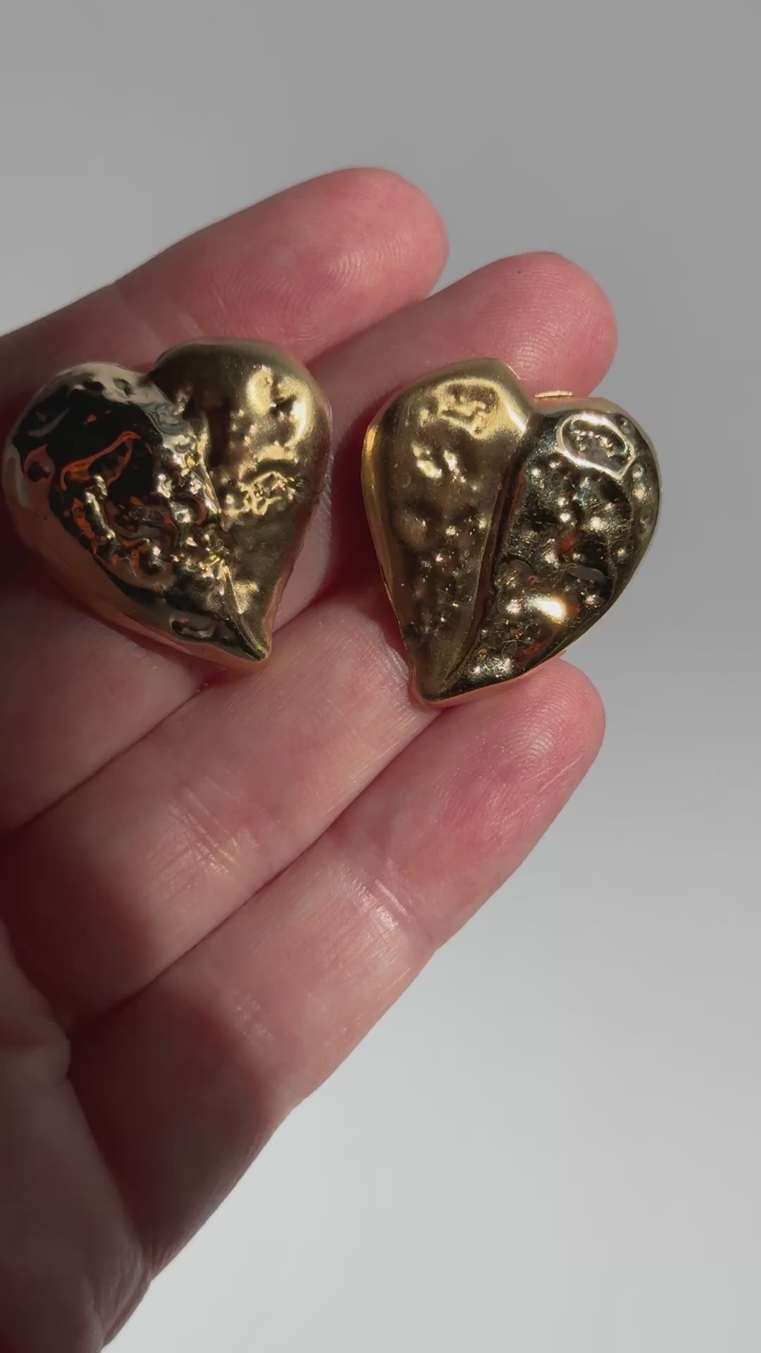 Weighing 2.7 grams, these large puffy hearts make a confident statement while maintaining elegant proportions. The repousse technique, where metal is hammered from the reverse to create raised relief designs, requires exceptional skill and creates the unique textural landscape visible across each heart's surface. The contrast between the mirror-bright polished sections and the organic hammered areas gives these earrings a contemporary feel while honoring traditional goldsmithing methods. Perfect for collectors of bold vintage jewelry or anyone who appreciates substantial statement earrings with artistic flair.