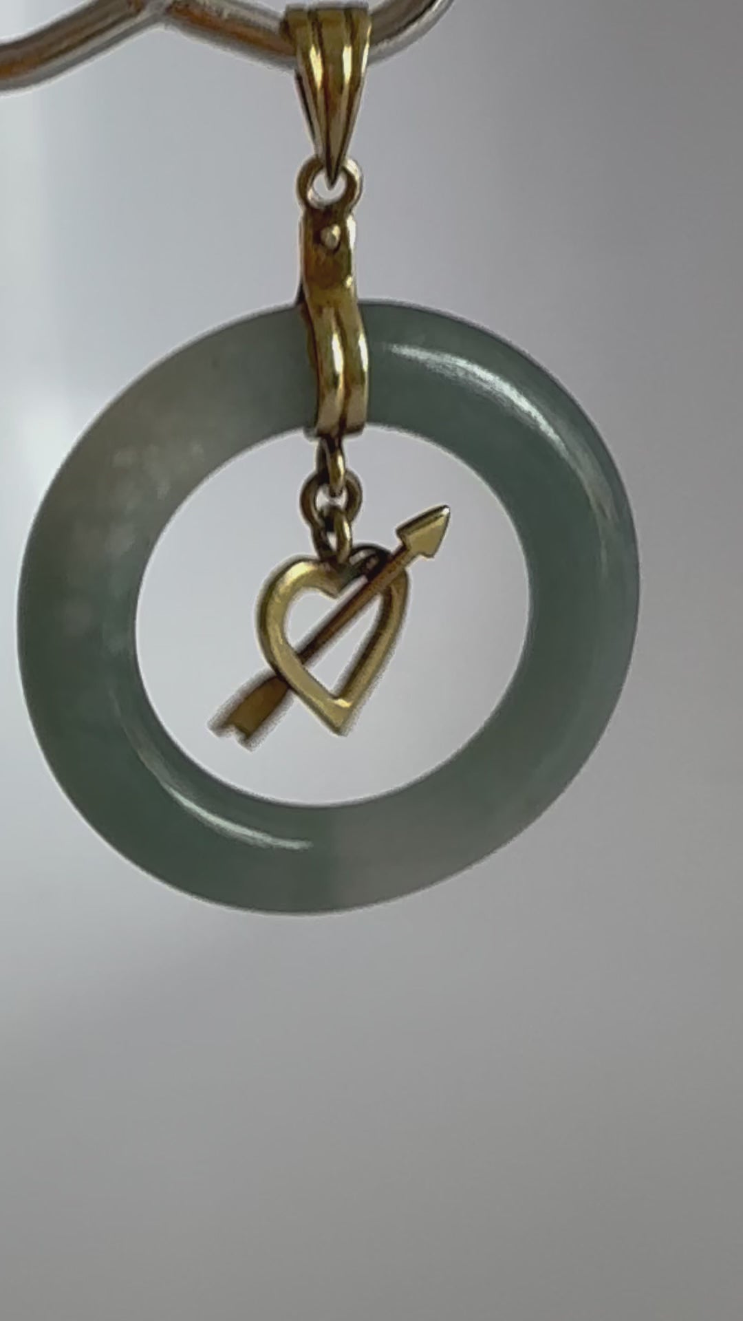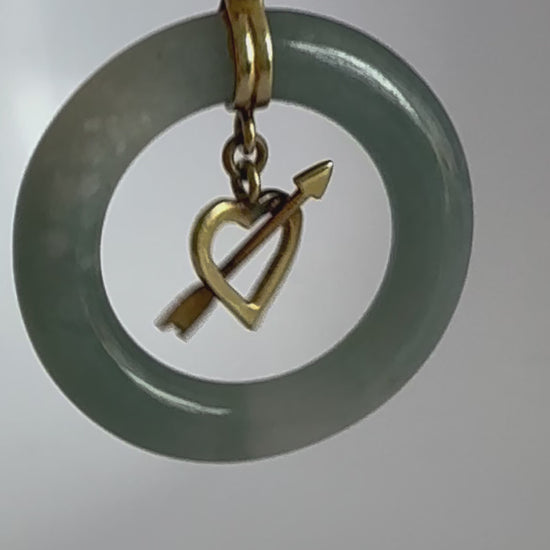 The translucent quality of the jadeite means it catches and filters light beautifully, while the warm yellow gold framework adds just enough contrast to make both materials sing. At 6.3 grams and 1.75 inches from bail to bottom, this has real presence without requiring its own zip code. The heart pierced by Cupid's arrow is a classic motif that's been making people smile for centuries, and this particular execution shows why some symbols endure.