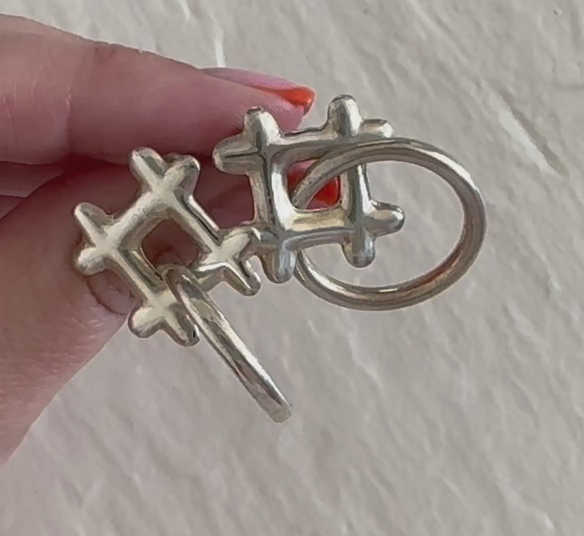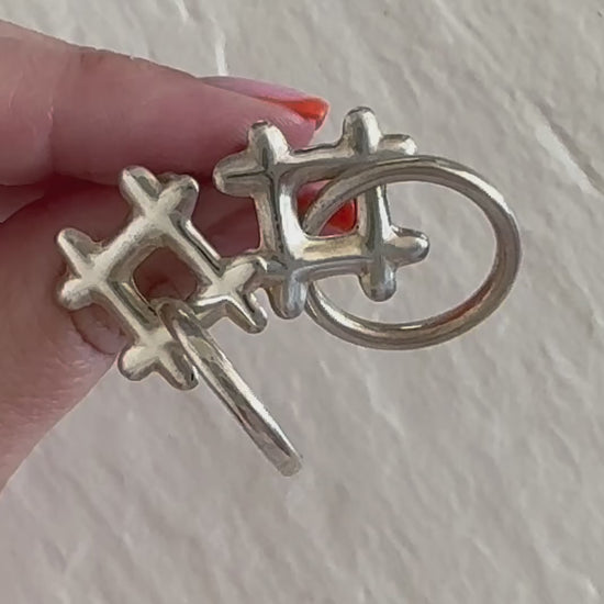Product Description: These unique estate vintage sterling silver post earrings feature an innovative abstract interpretation of X's and O's (hugs and kisses) with dangling hoop elements. Dating from the 1980s, these distinctive vintage earrings showcase dimensional sterling silver cross elements that connect to circular hoops, creating a playful yet sophisticated take on the classic romantic symbol. The polished finish and substantial weight reflect quality 1980s estate craftsmanship.