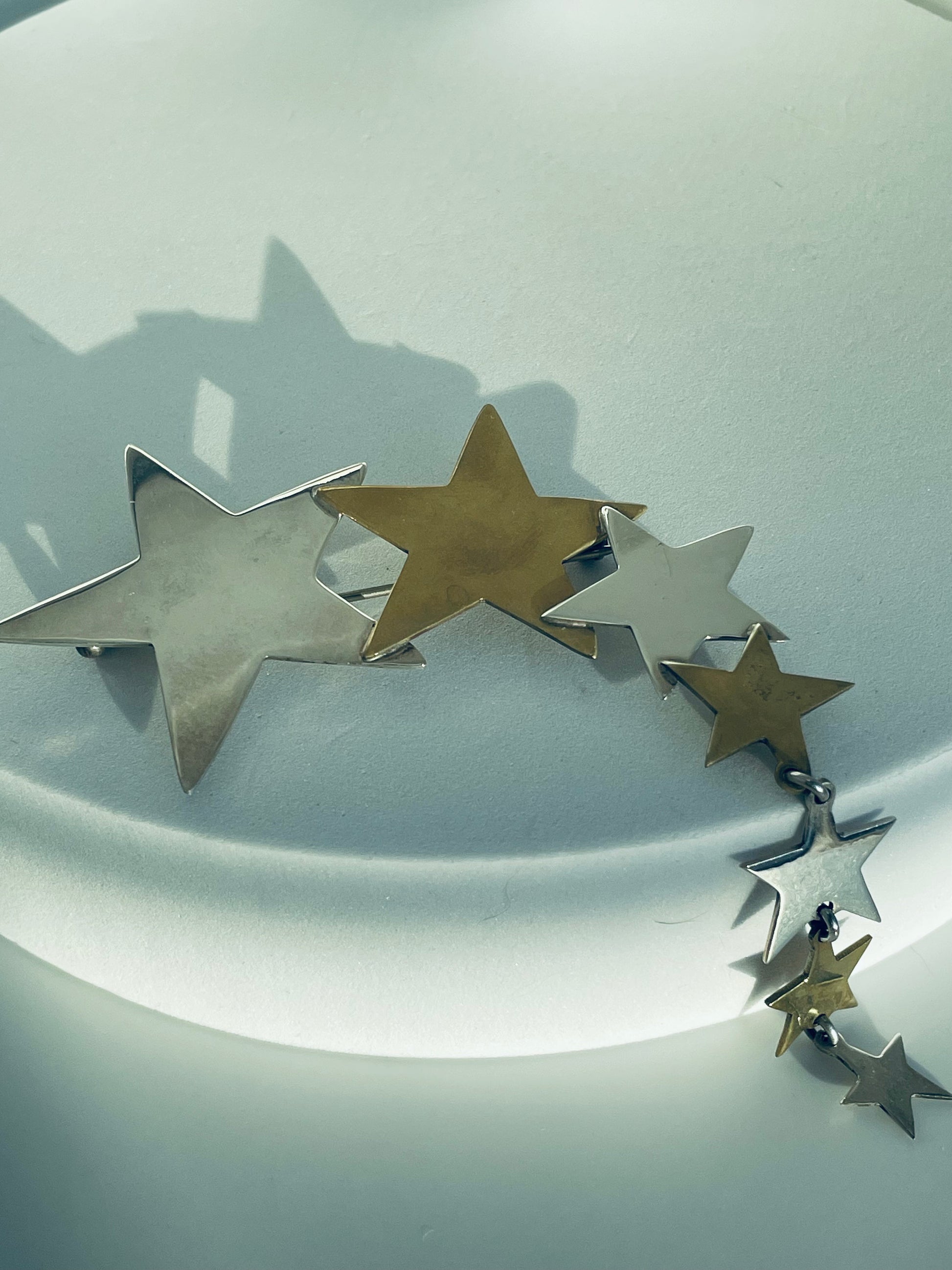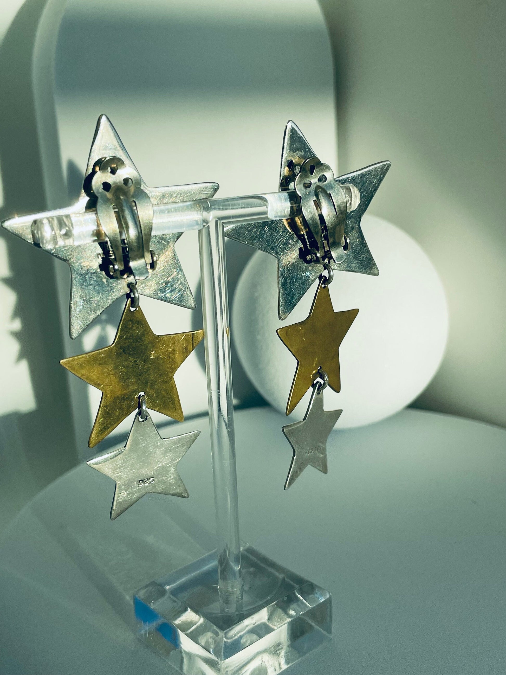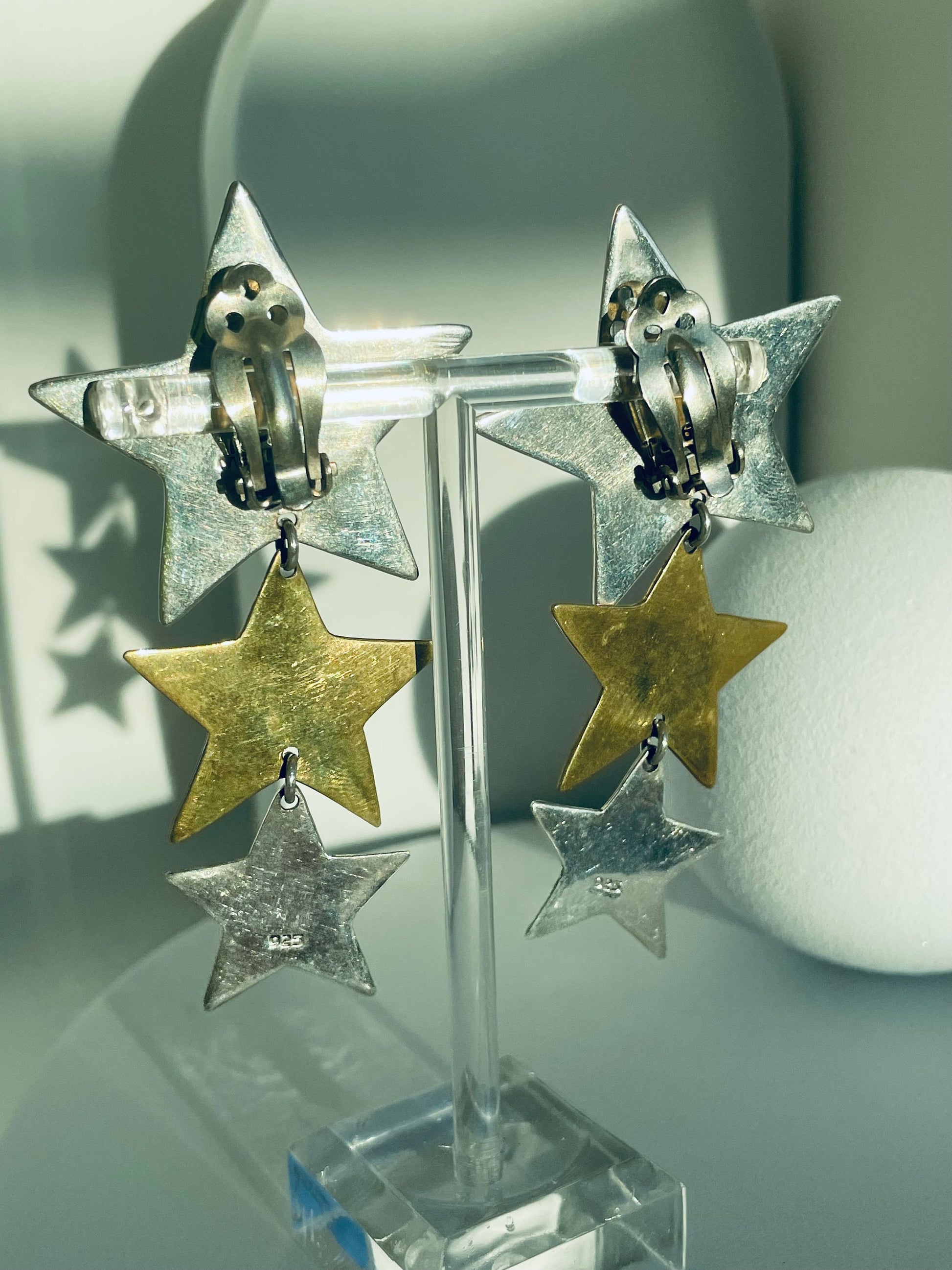 Fantastic Large Sterling and Brass Star Earrings and Pin Set, Taxco Mexico