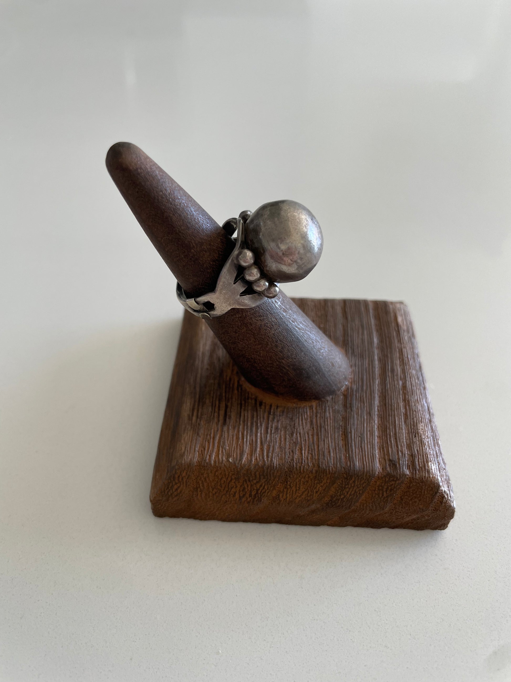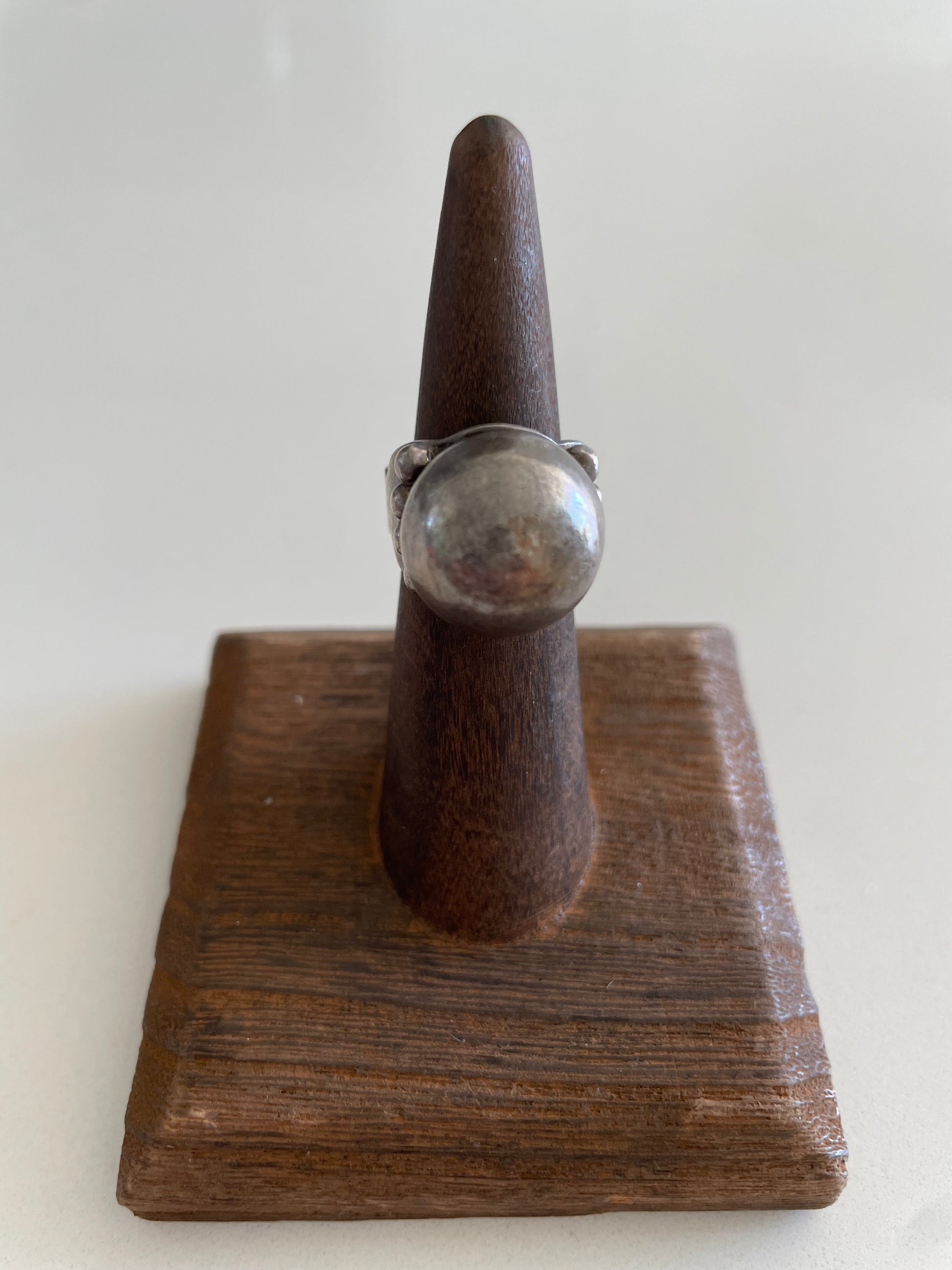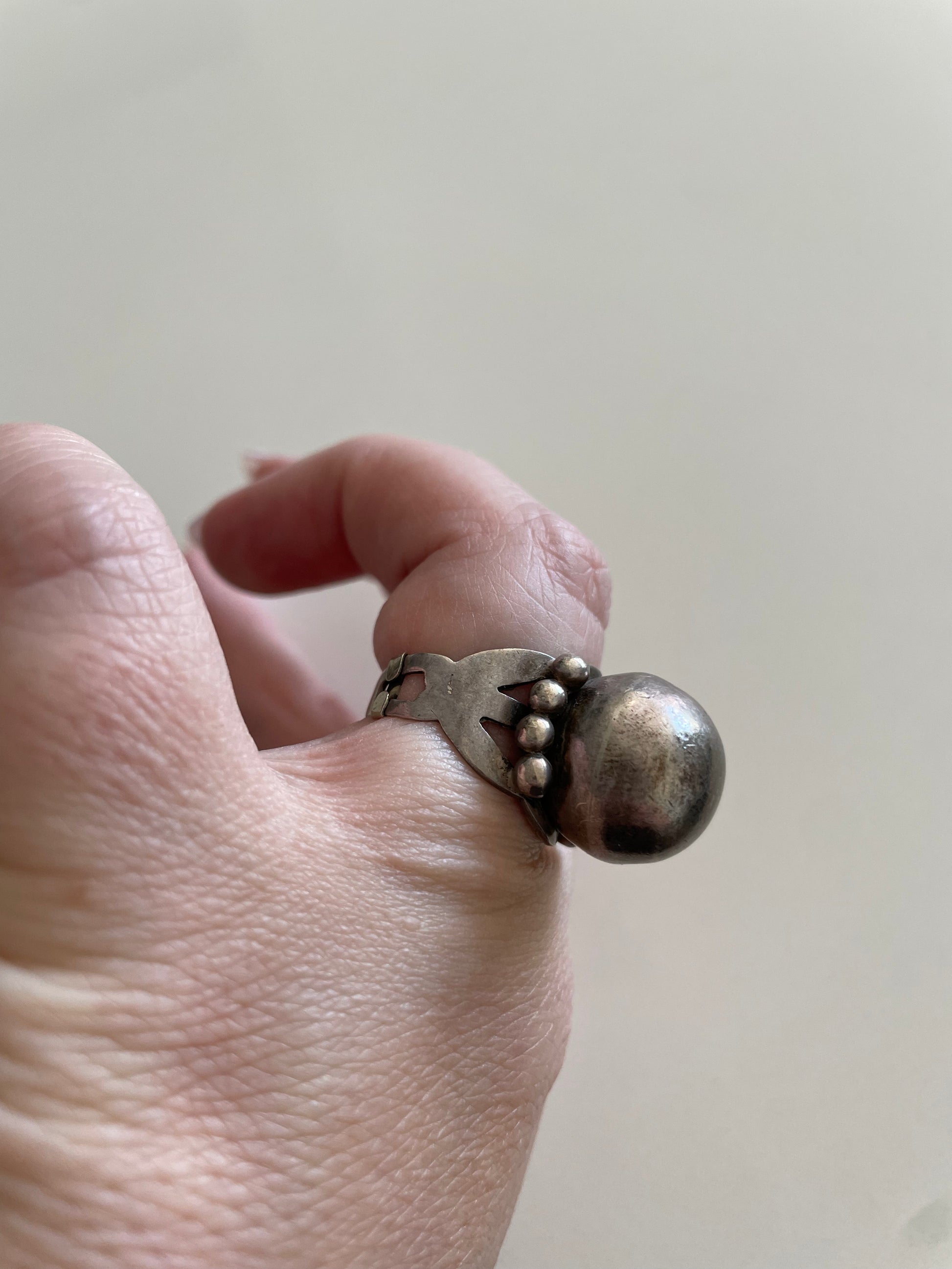 This vintage ring is really spectacular. The Fred Harvey Trading Company was popular in the mid 1940s and created jewelry for the tourist population in the southwest. This ball Motif ring was quite popular and without dents is rare to find today. Please check out photos for size and weight.