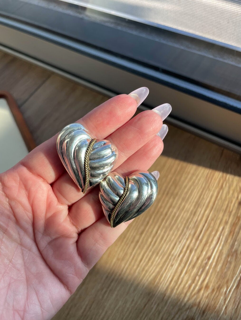 Giant Vintage Swirly Heart Sterling and Brass Earrings