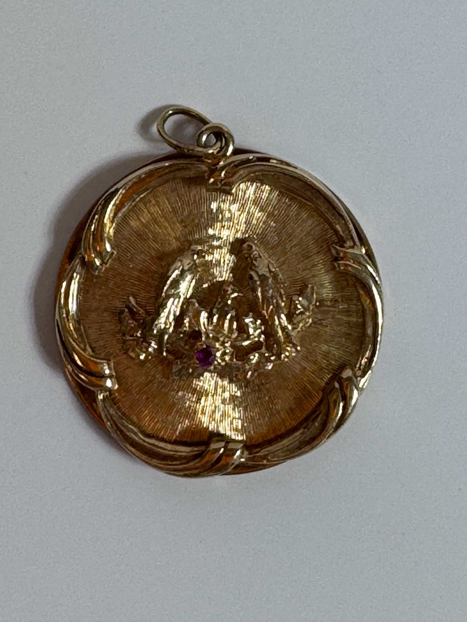 Heavy Mid Century 1950s Love Birds Medallion Pendant 14K Gold - Romantic Vintage Estate Jewelry Ruby Accent