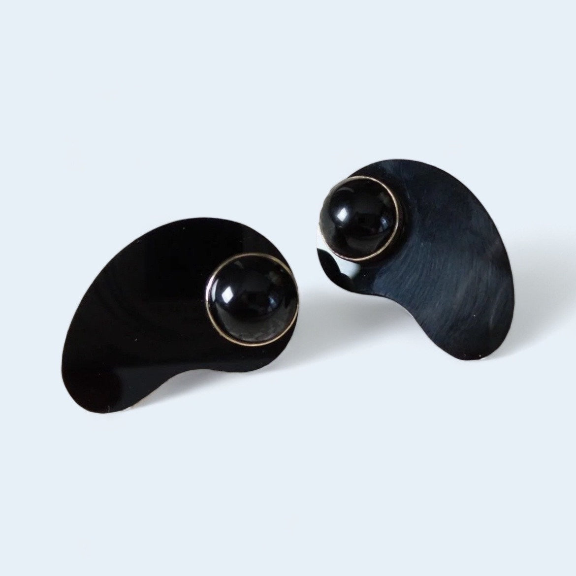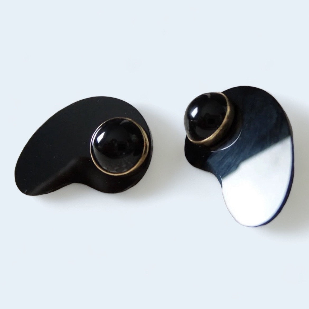 Mid Century Modern Onyx Black Glass and 14k Yellow Gold Amoeba earrings