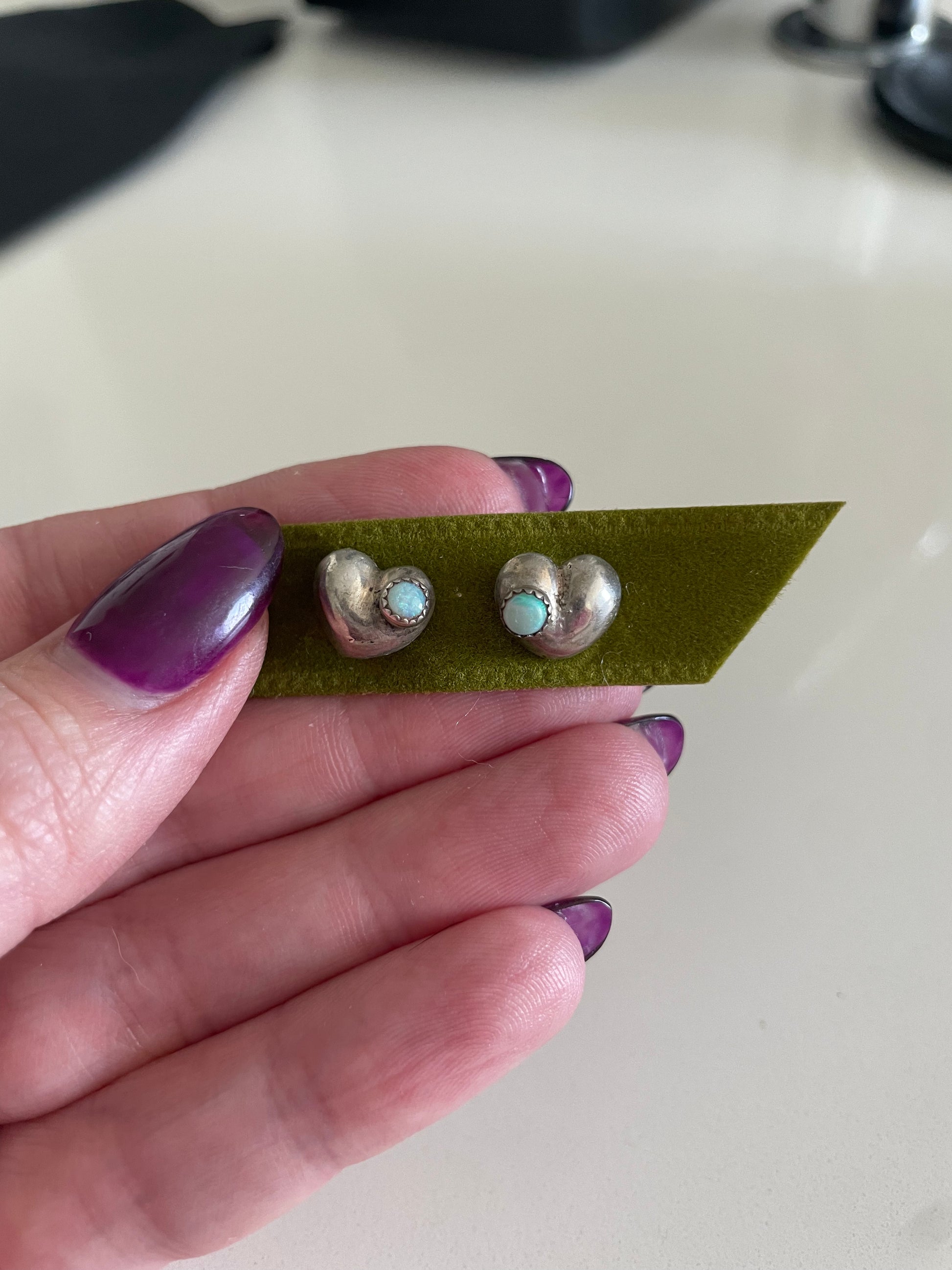 These opal and sterling heart stud earrings are tiny but mighty. The stone has much fire and the hearts would look great paired with hoops in your second holes!