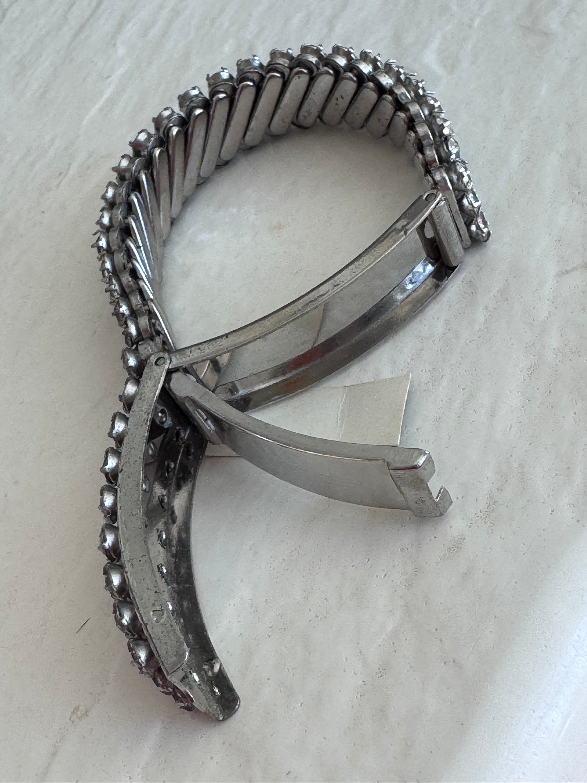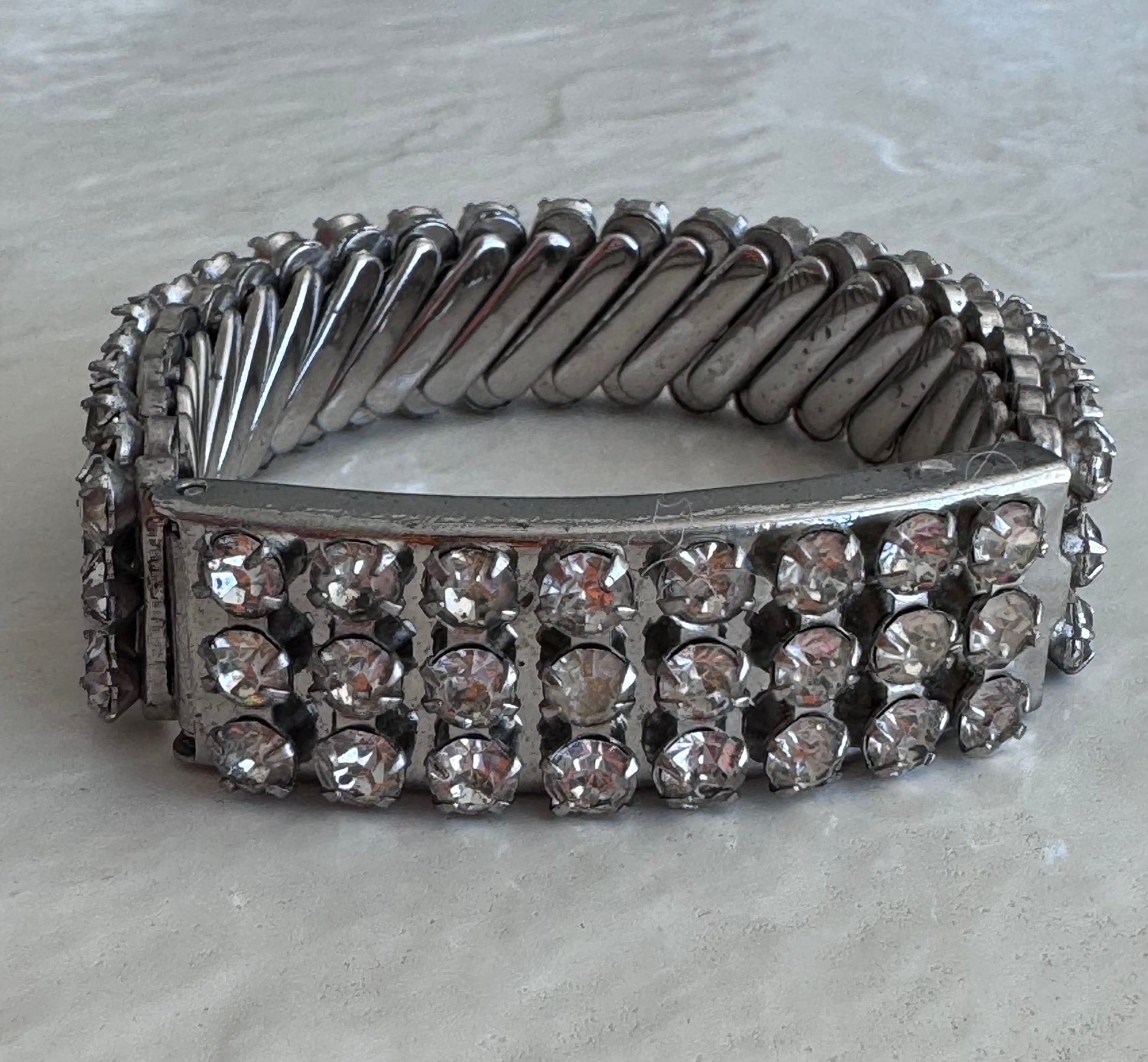 Condition: Vintage condition with excellent functionality. Rhinestones clear and secure in settings with beautiful sparkle. Expandable mechanism operates smoothly. Locket opens and closes properly. Original vintage photo included. Some minor age-appropriate patina on metal elements.