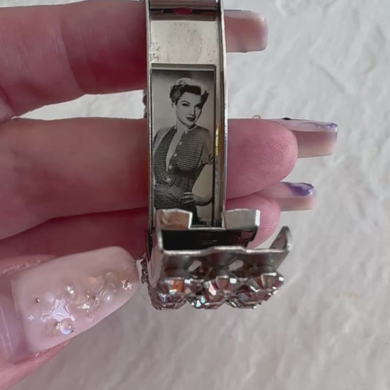 The expandable design means this fits most wrists comfortably, while the substantial construction suggests this was a quality piece, not a dime store trinket. The rhinestones remain brilliant and secure in their settings, creating that signature 1950s sparkle that made every woman feel like a movie star. The photo locket opens to reveal space for a personal photograph, though it currently showcases its original vintage pin-up image.