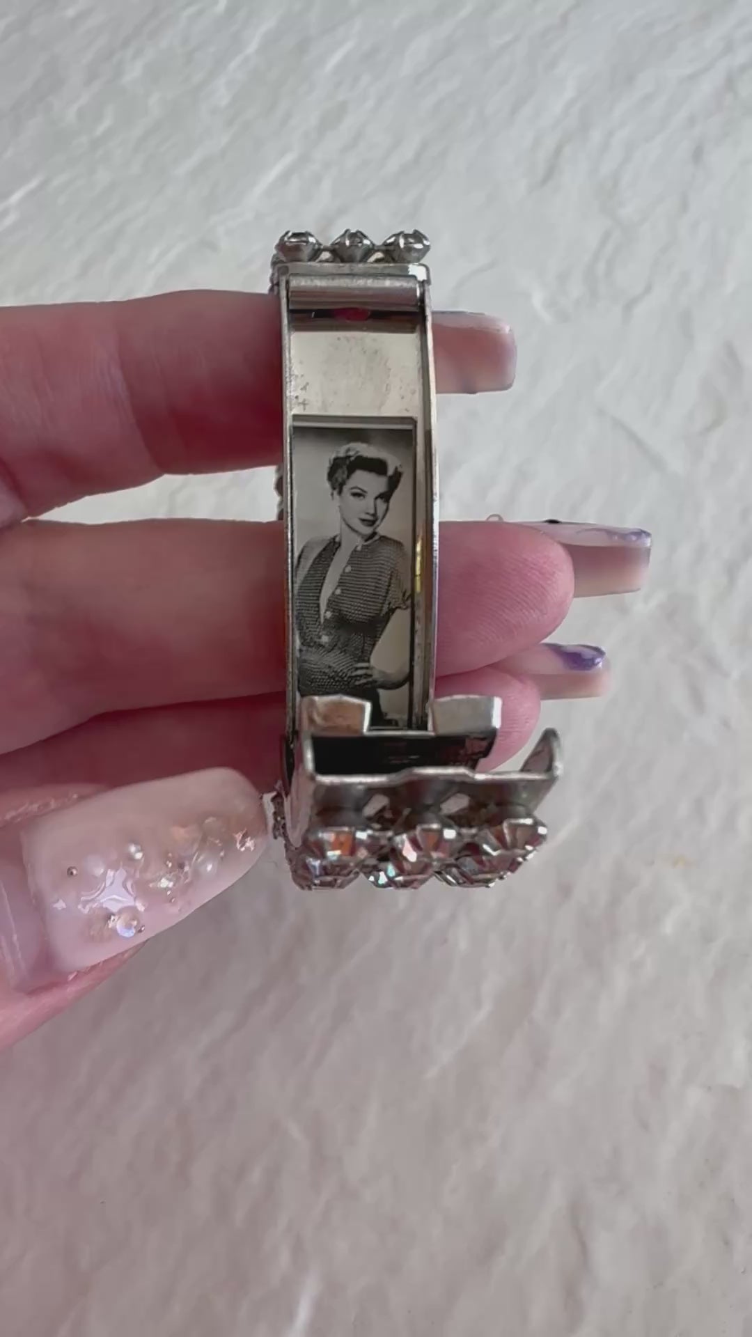This sweetheart bracelet captures the romance and glamour of 1950s pin-up culture perfectly. The expandable rhinestone band sparkles with rows of clear crystals, while the rectangular locket center holds a vintage photo of a beautifully styled woman in classic 1950s pose. The combination of functional photo display and dazzling rhinestones represents the era when costume jewelry reached artistic heights.