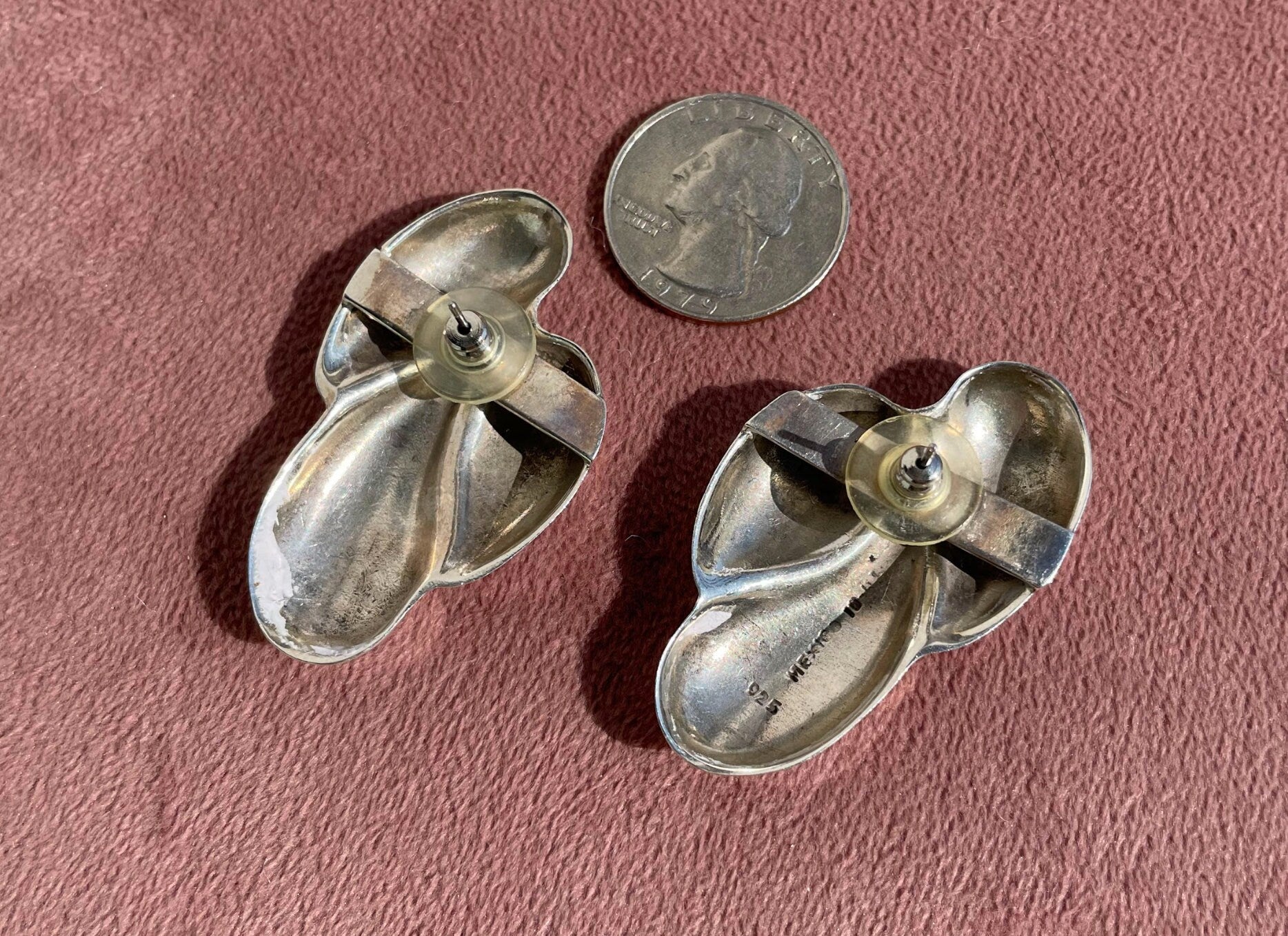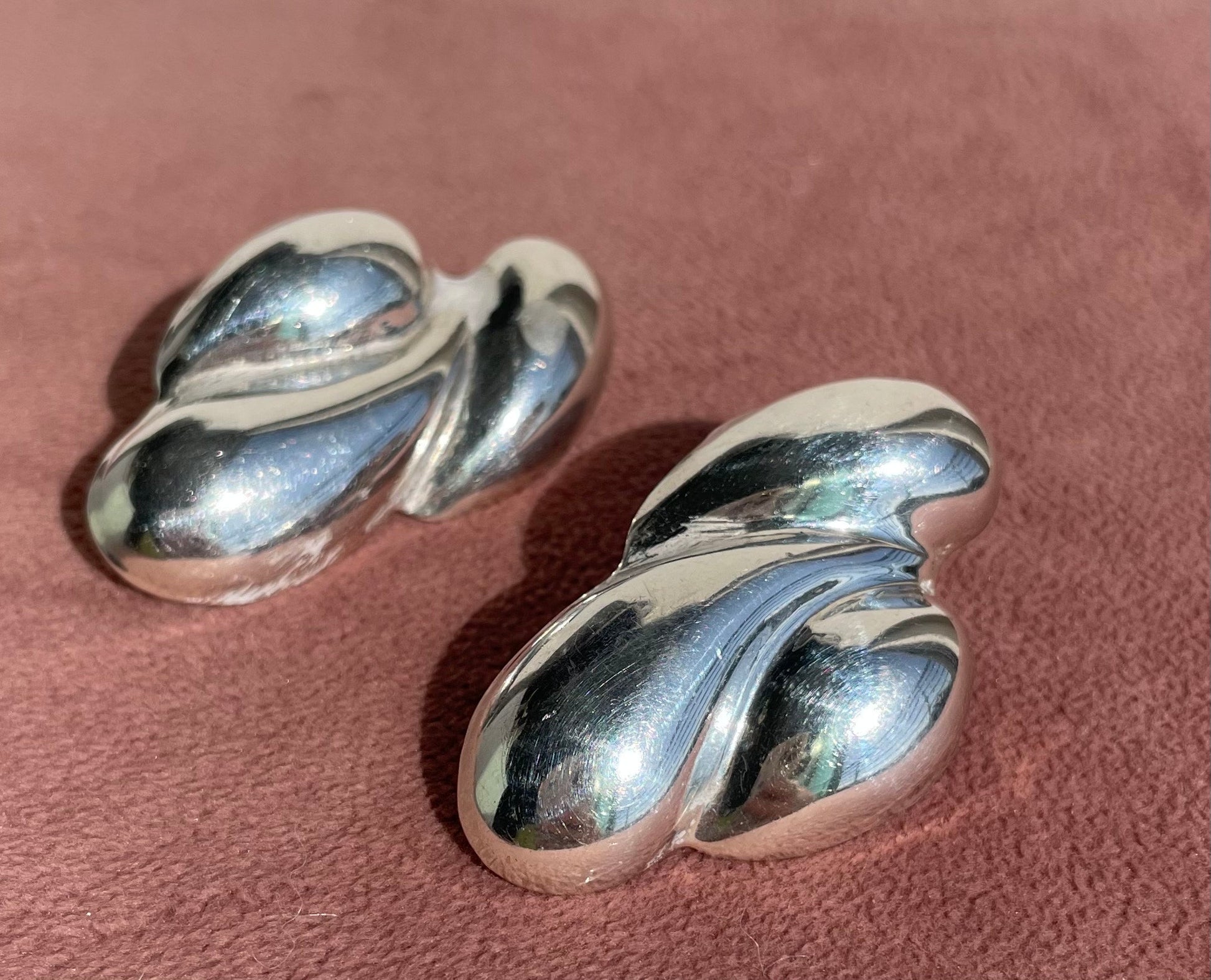 These earrings are lucious. The sterling is bright with a beautiful patina. They are a repousse design so they are solid but not too heavy.