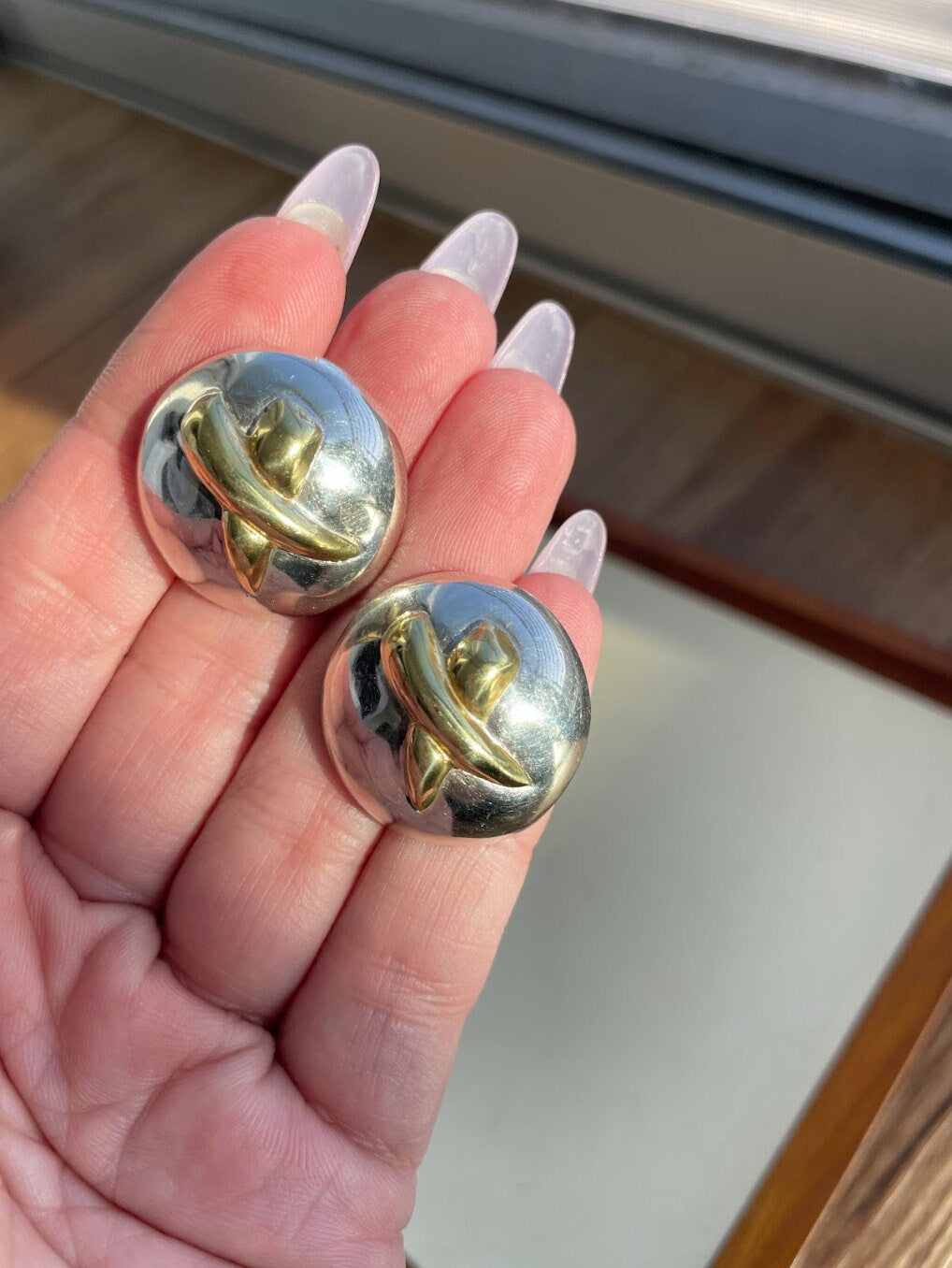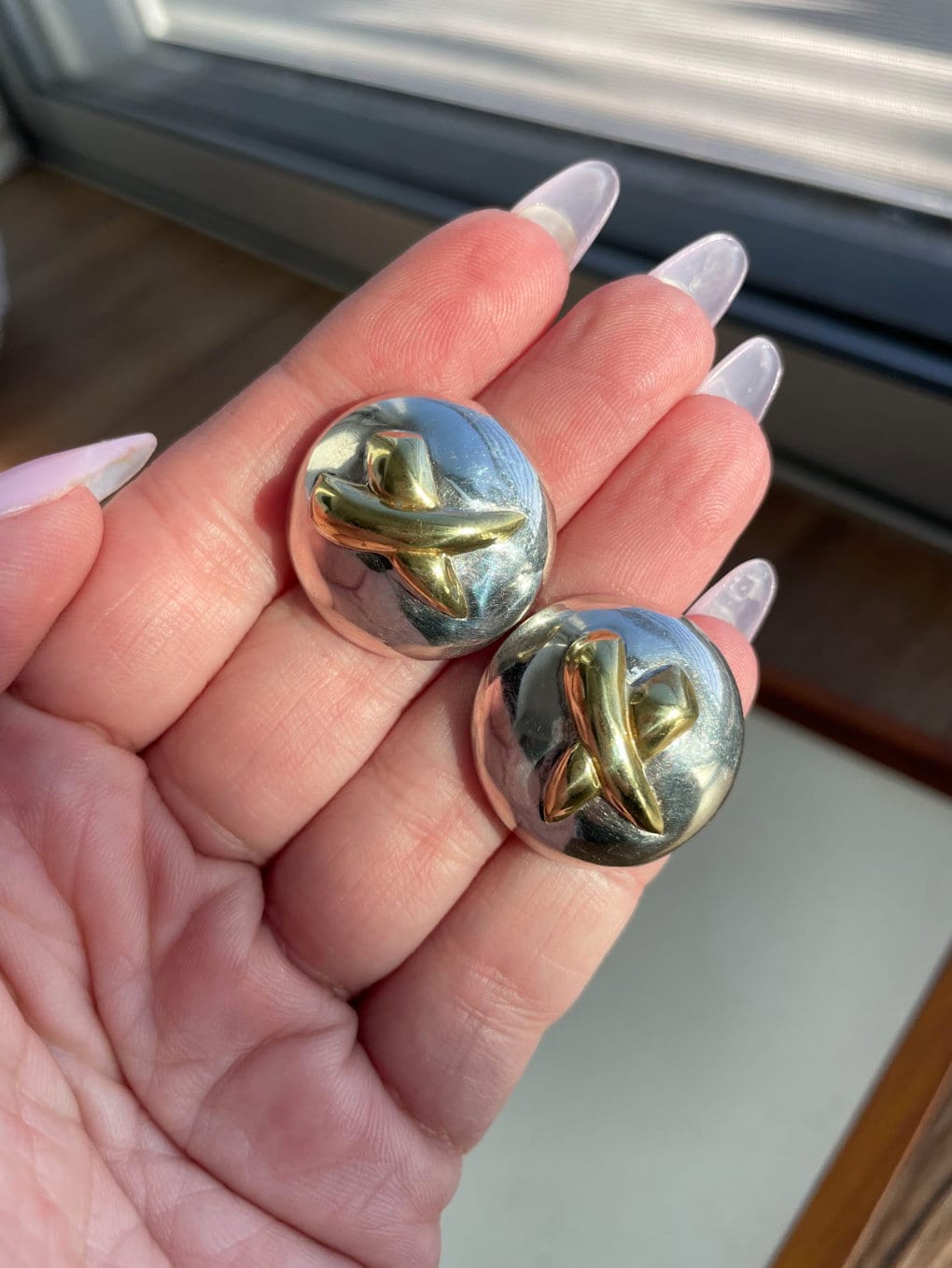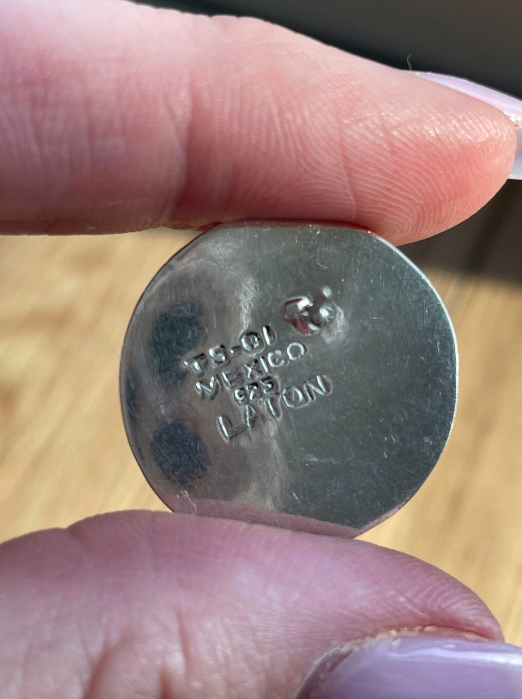 Oh do you fancy yourself a lady with taste? Well these go with a power suit, a bathing suit, or a jogging suit. Created and signed by the famous silversmith company Laton these studs are mixed metal. The X’s could be gold plate or brass. They are marked sterling and I did not want to acid test the X should I damage the earring. They will come with non-sterling backs.