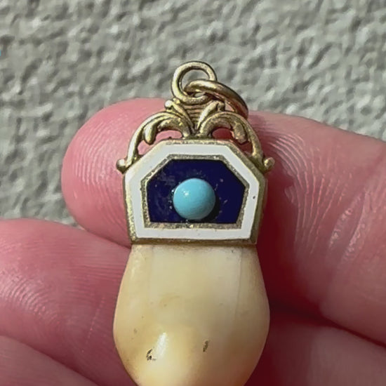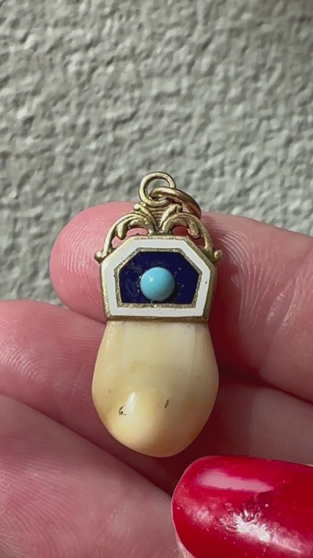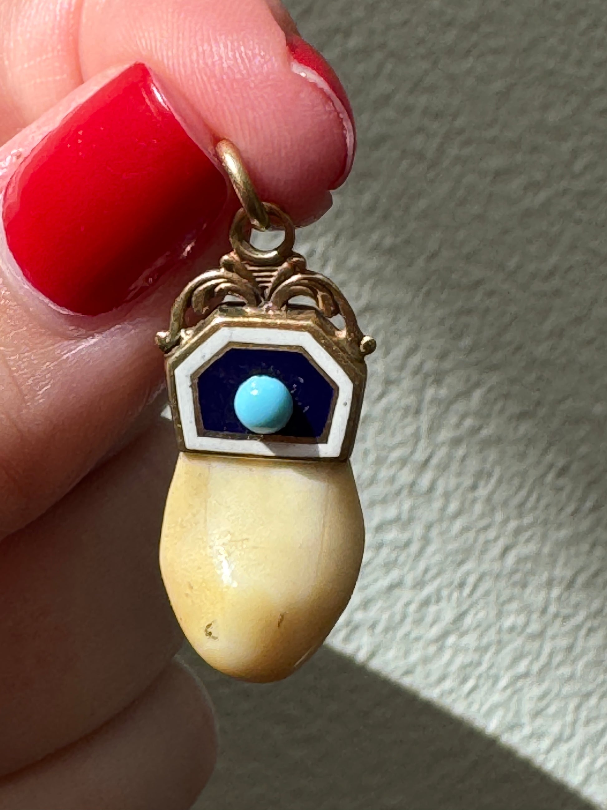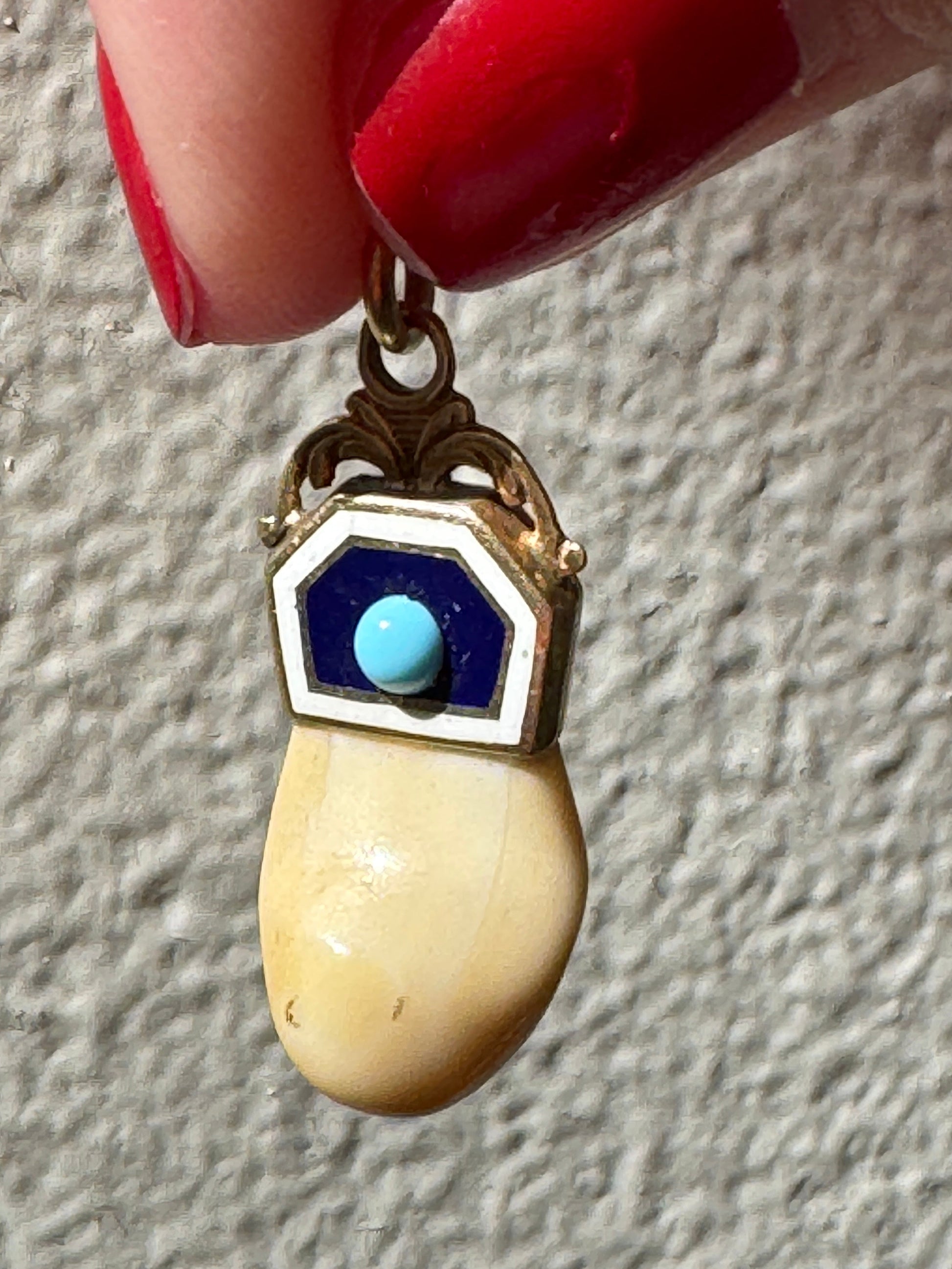 Vintage Estate 10K Gold Elks Tooth Charm Pendant Enamel Turquoise