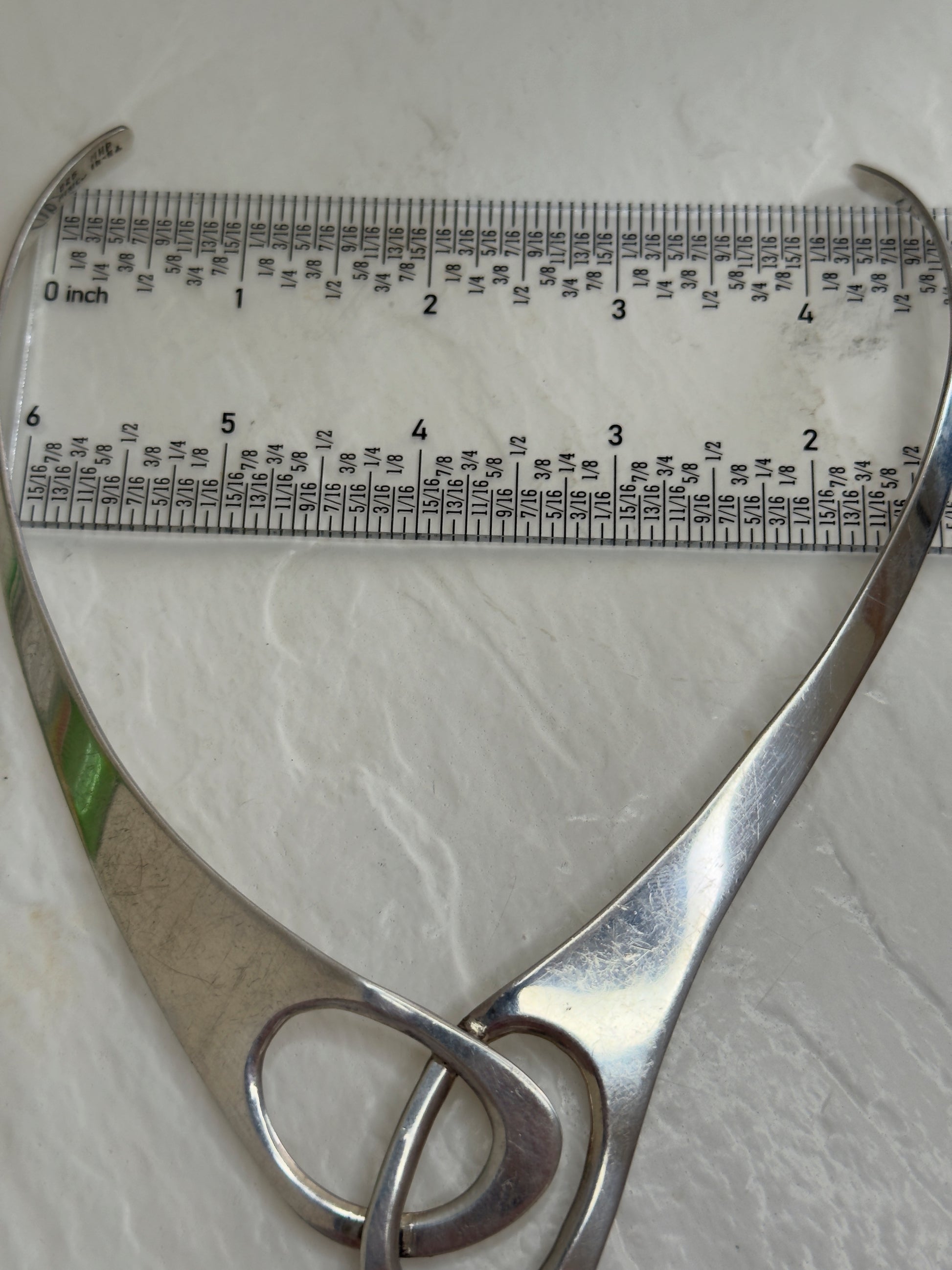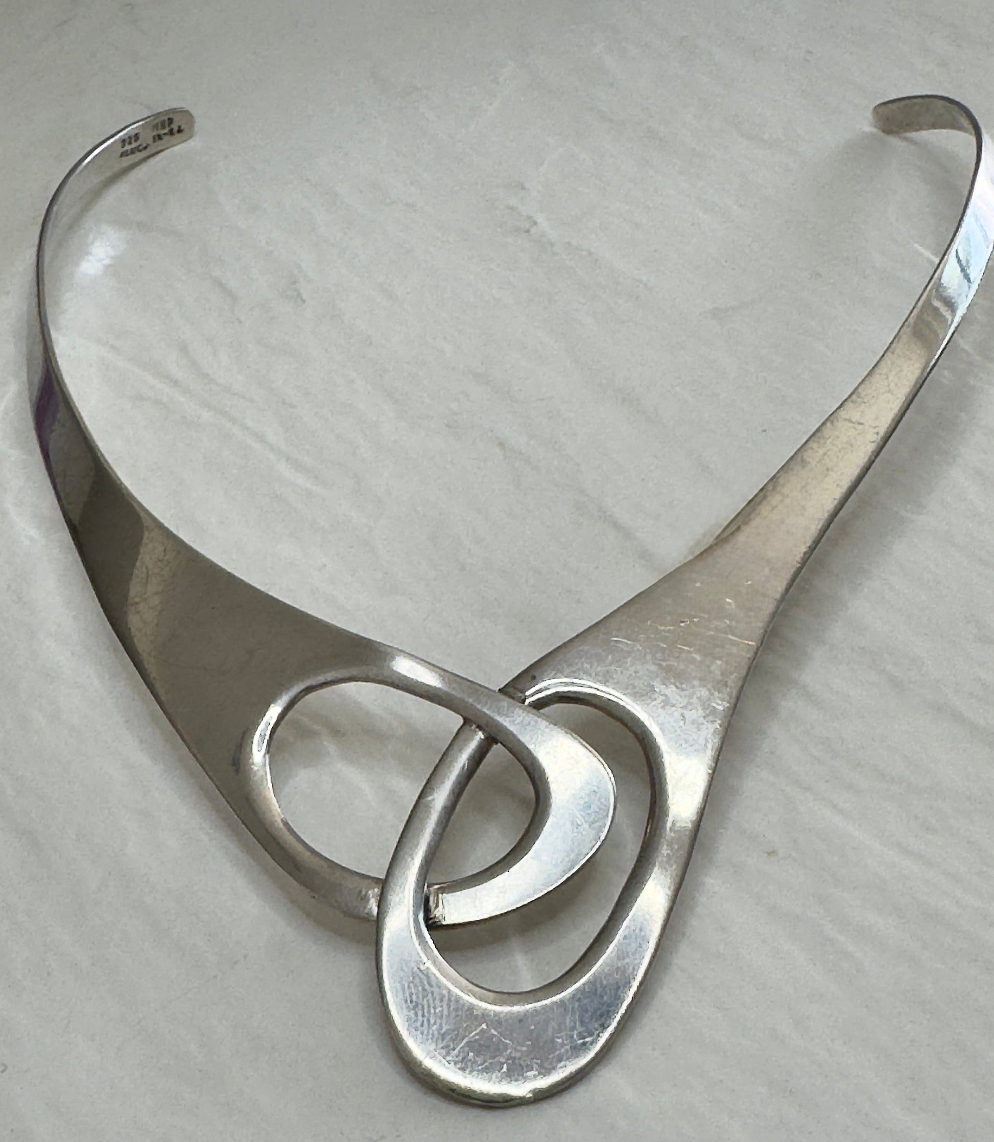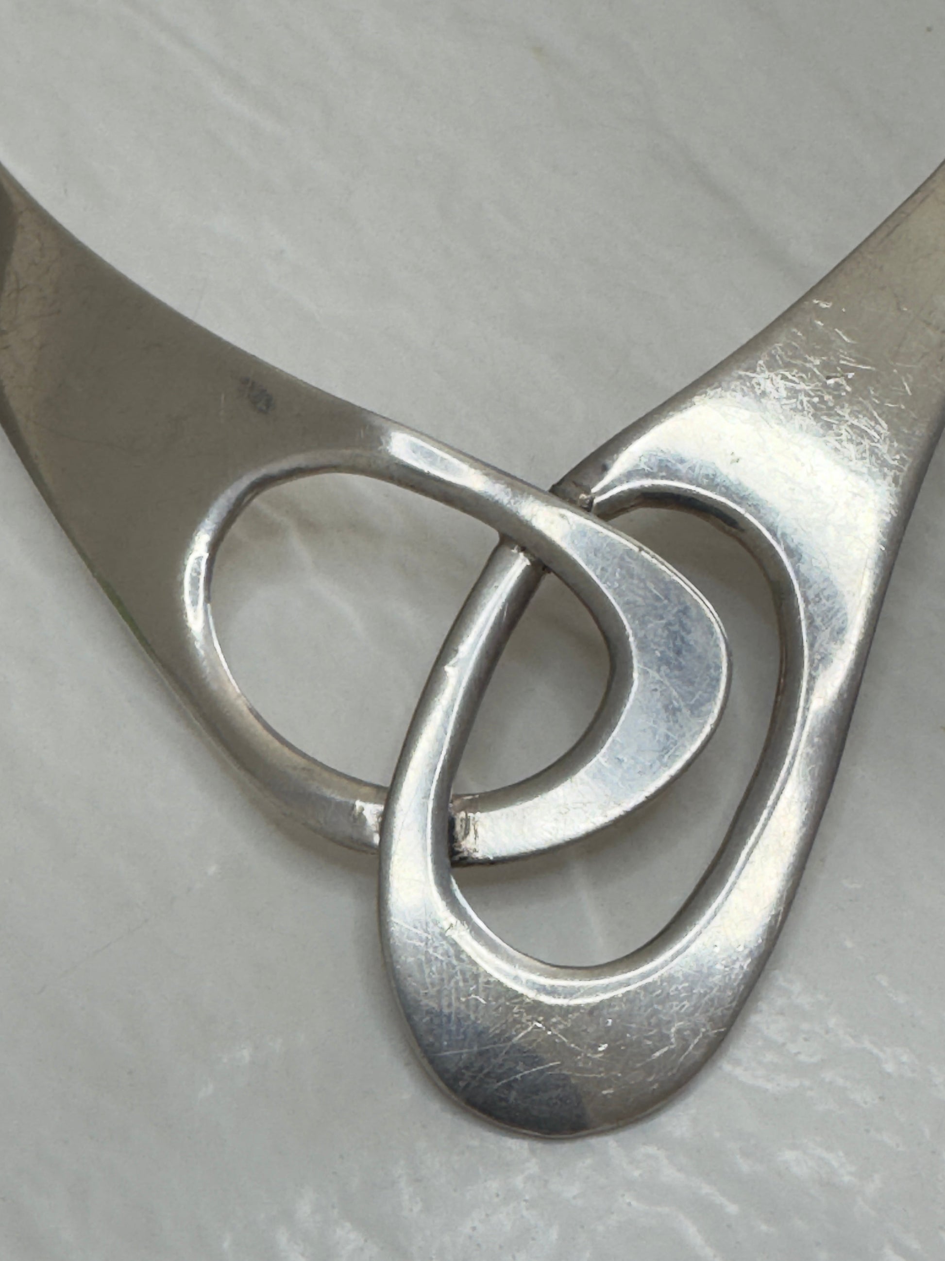 This vintage Mexican modernist collar necklace features two intertwined oval circles at the front that transition into a sleek tapered band around the neck. The sophisticated design showcases the artistic craftsmanship of Mexican silversmiths with its flowing, sculptural form. The collar is designed to be gently shaped to fit your neck size without hinges or clasps.