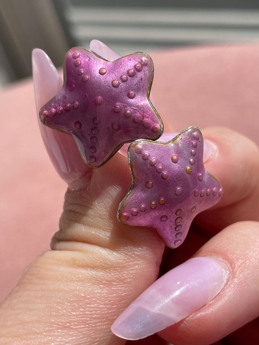 These little guys are spectacular. They are a beautiful shade of sparkly lavender and they have and interesting look and feeling of depth due to the enamel work. I am going to date them as vintage but an unknown era.
