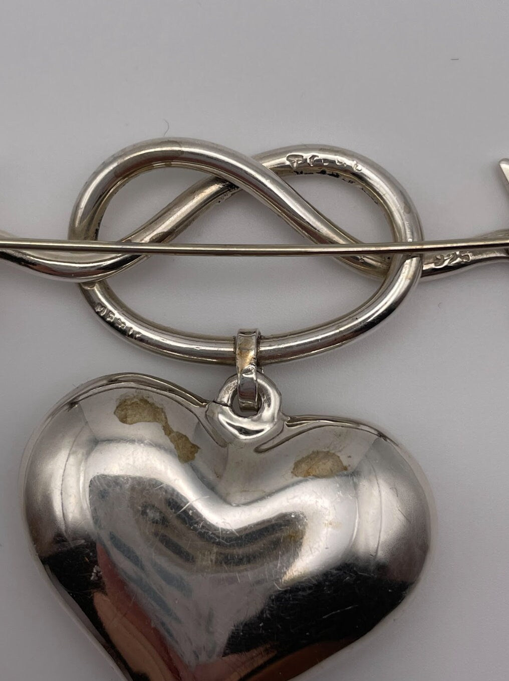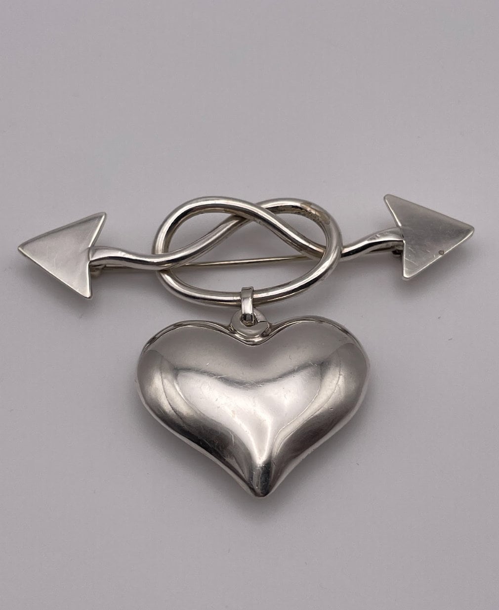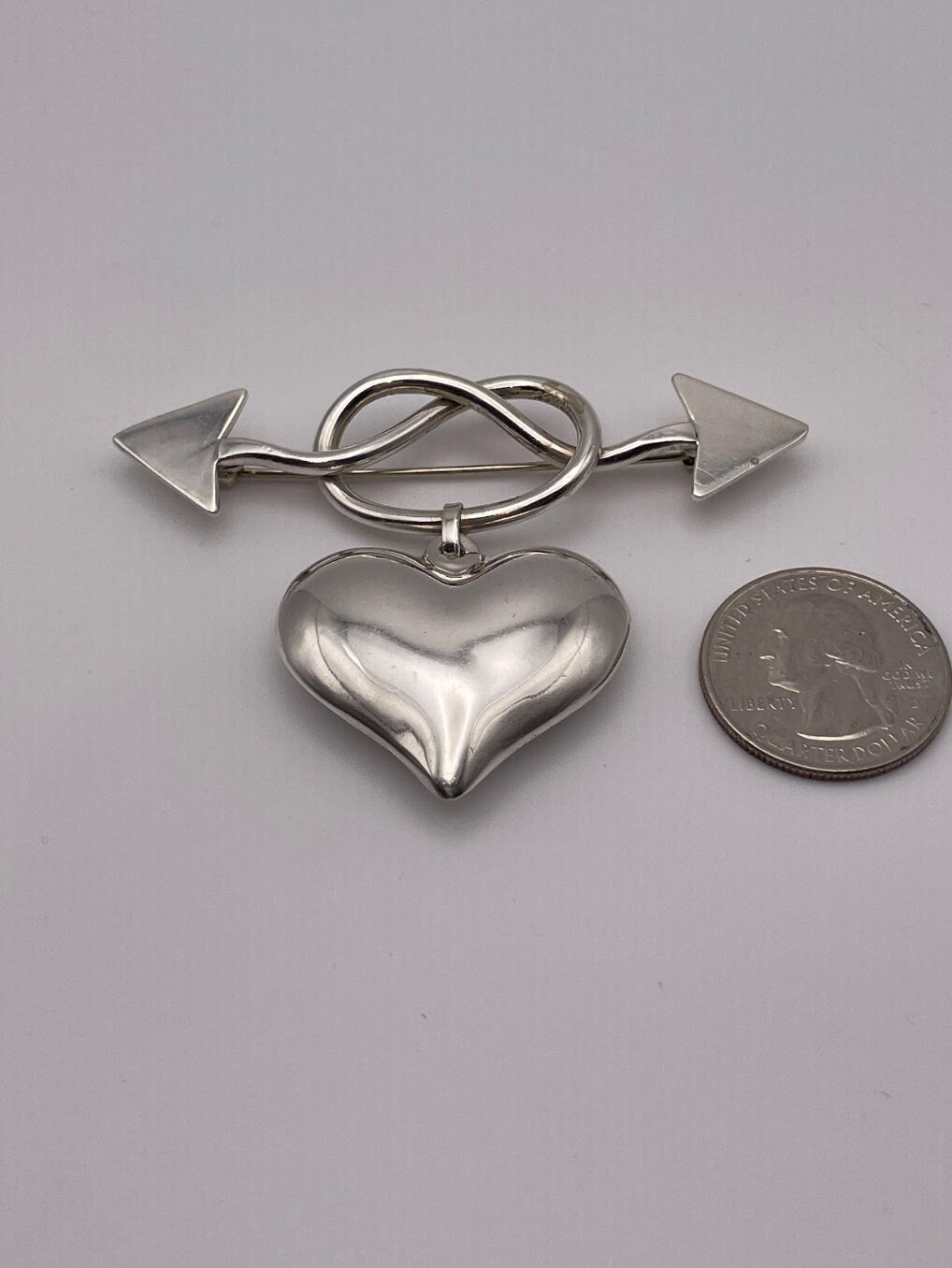 Vintage Love Knot Heart and Arrow Sterling Silver Bow Brooch Pin