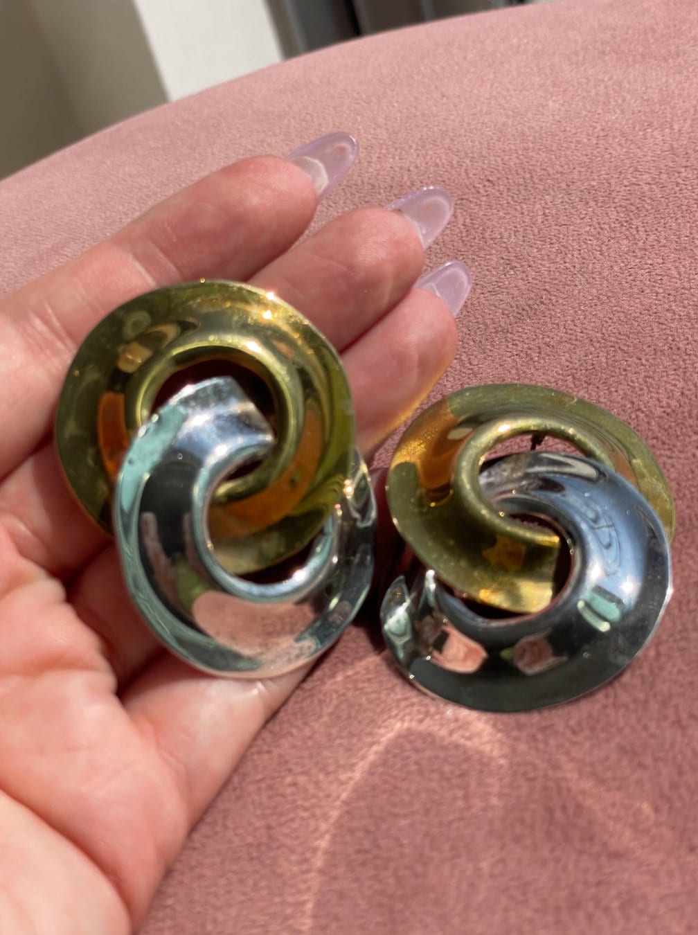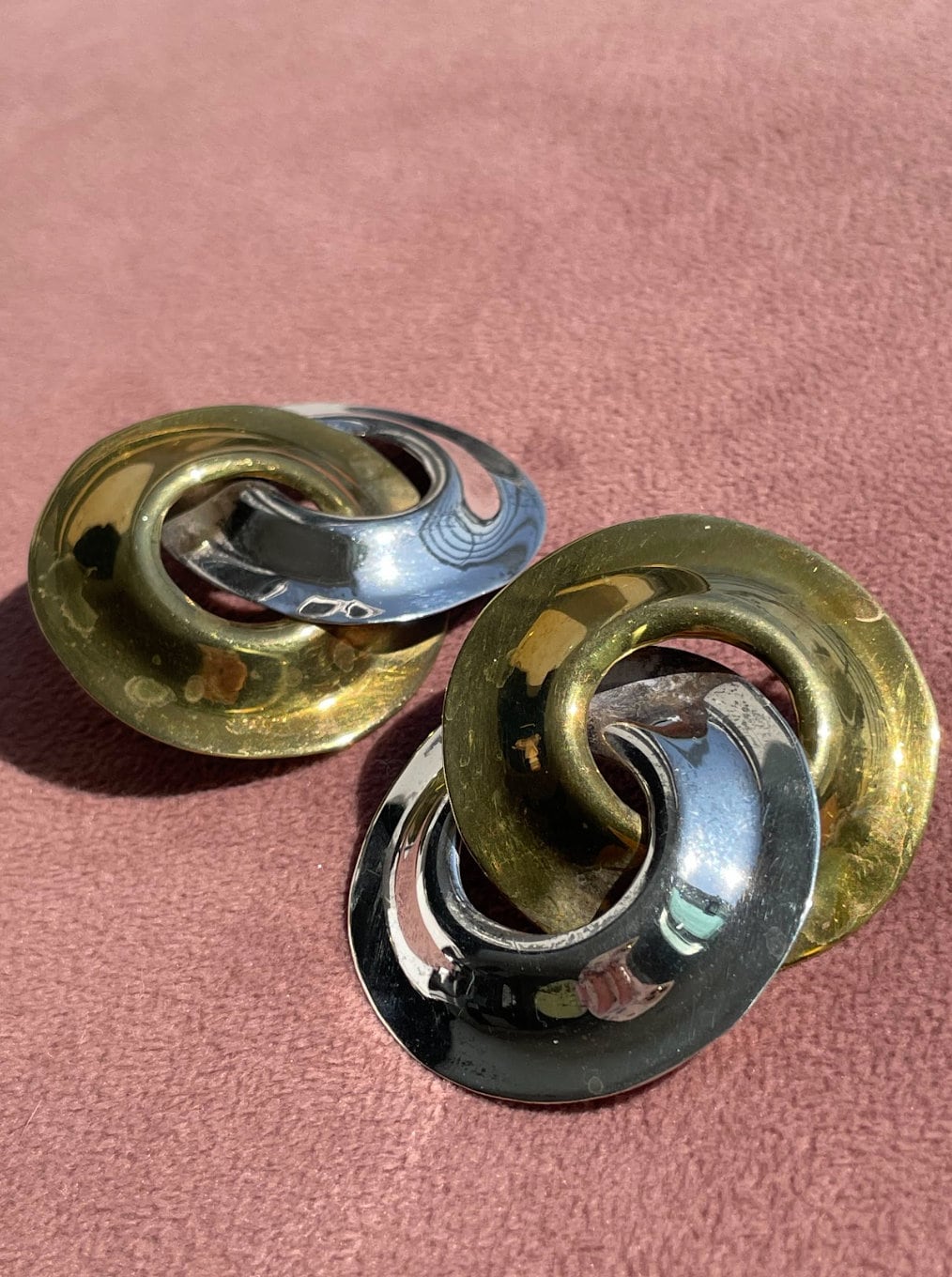 Ooooh hoppy hoops but to the side! These fabulous earrings are bright and beautiful. They are big and sit on the ear beautifully. I am not sure if the brass portion is solid or plate on sterling. They are vintage and handmade so they have and interesting vibe.