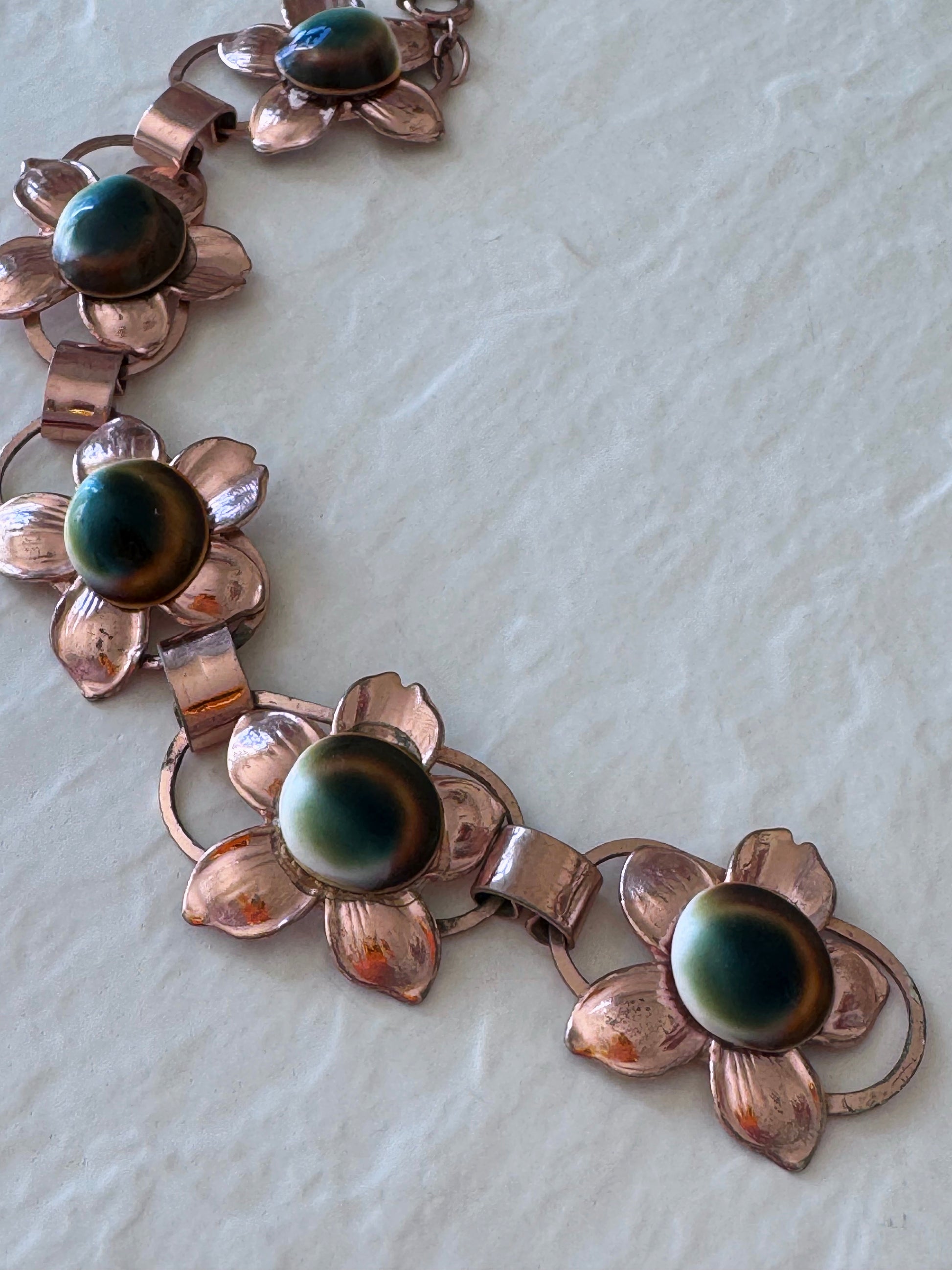 This vintage rose gold filled bracelet features five dimensional flower links, each centered with a natural operculum shell cab that displays mesmerizing green and gold iridescent patterns. Operculum, the protective "door" of certain sea snails, creates natural swirled patterns that make each shell unique. The rose gold filled construction gives this piece the warm, rich color of solid rose gold while ensuring durability and affordability that made it accessible to mid-century jewelry lovers.