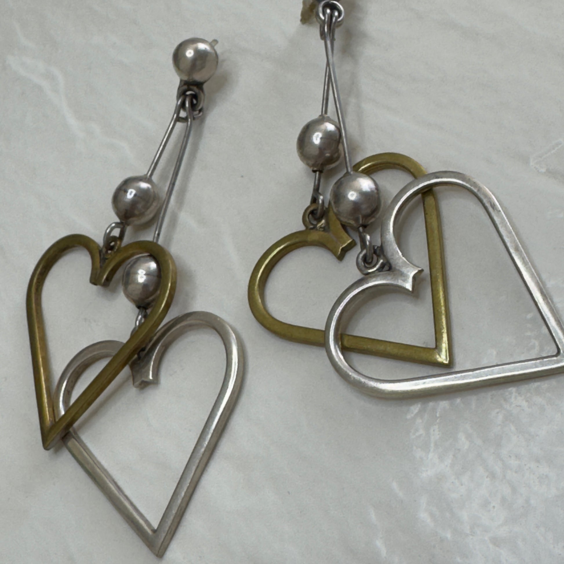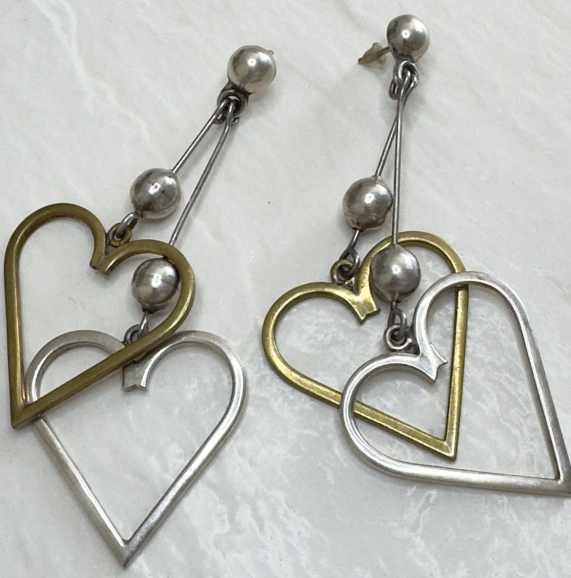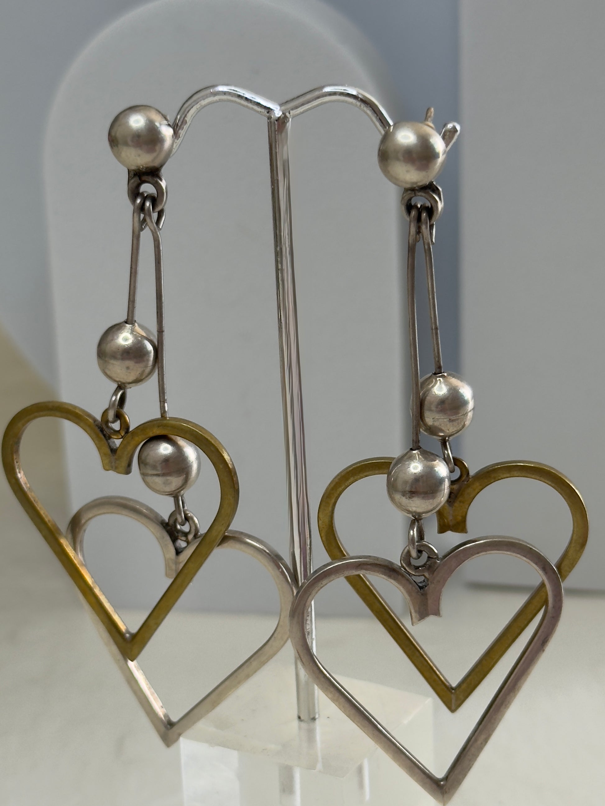 These striking vintage estate sterling silver earrings from Taxco, Mexico feature a playful kinetic design with multiple polished silver beads cascading down to open heart pendants. The post earrings showcase beautiful mixed-metal construction with brass-toned heart outlines contrasting against sterling silver heart frames, creating dimensional depth and visual interest. Each earring measures approximately 90mm in height and 36mm in width, with substantial 25-gram total weight that reflects quality Mexican craftsmanship.