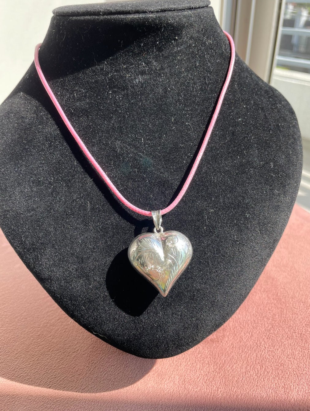 This is one scrolly little heart with a lot of pizzazz. The work is lovely and it is in good vintage condition. It will come with a corded necklace color of your choice.